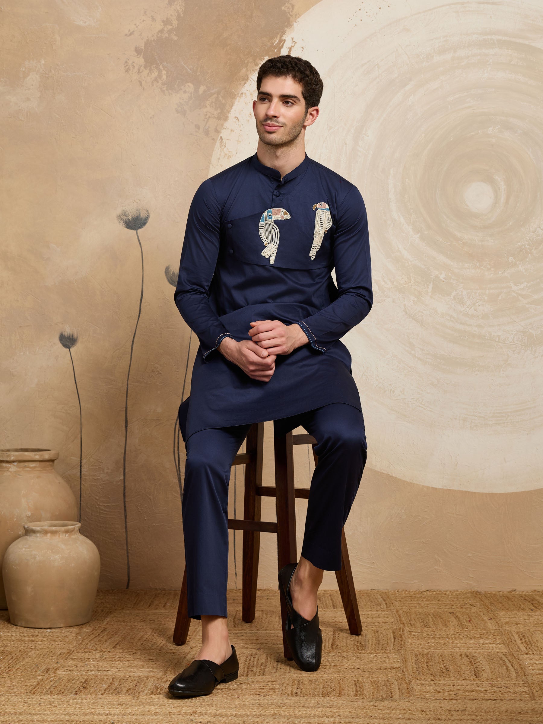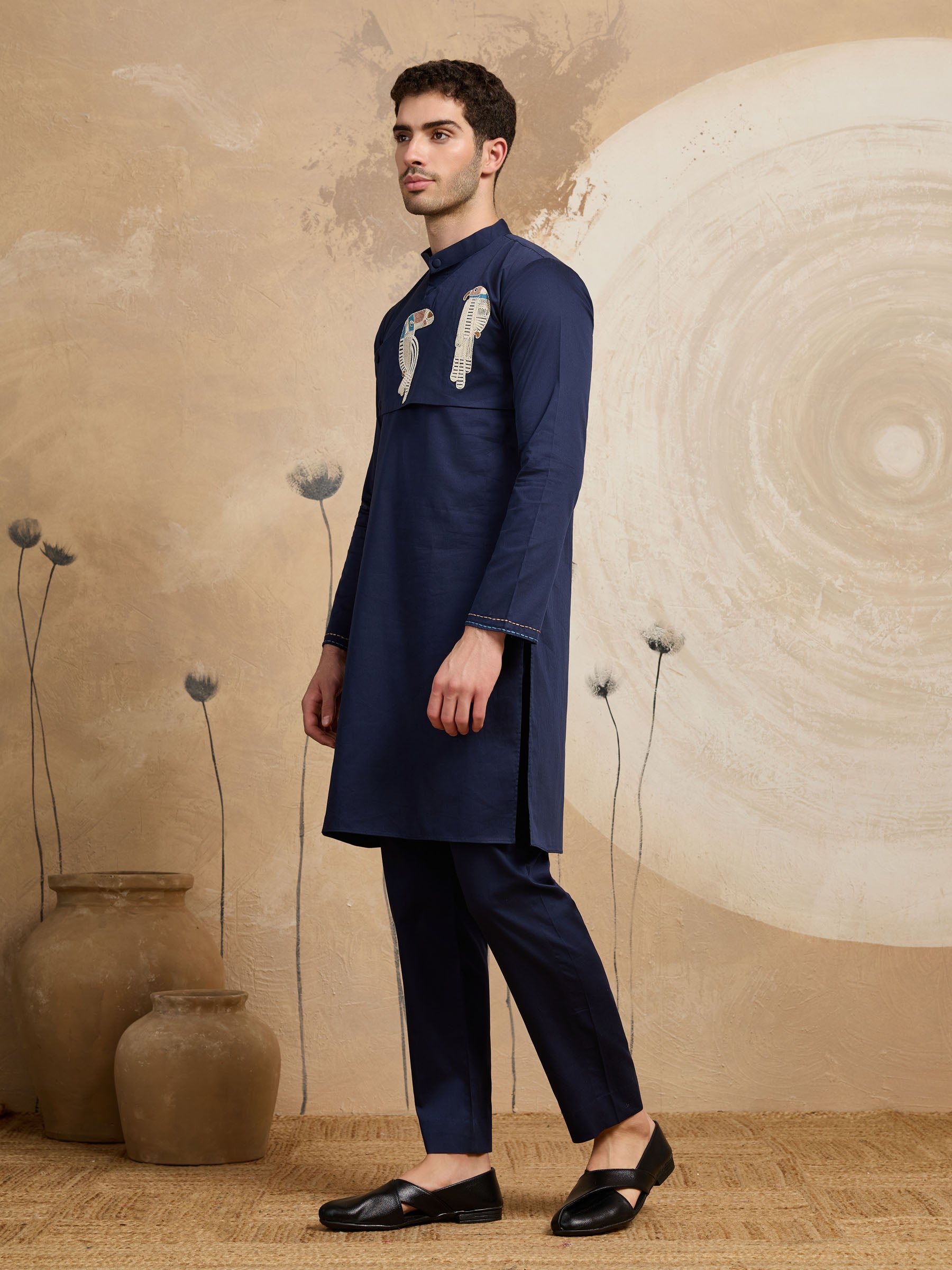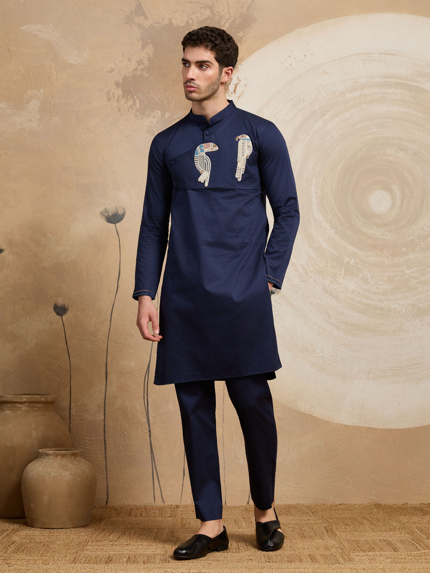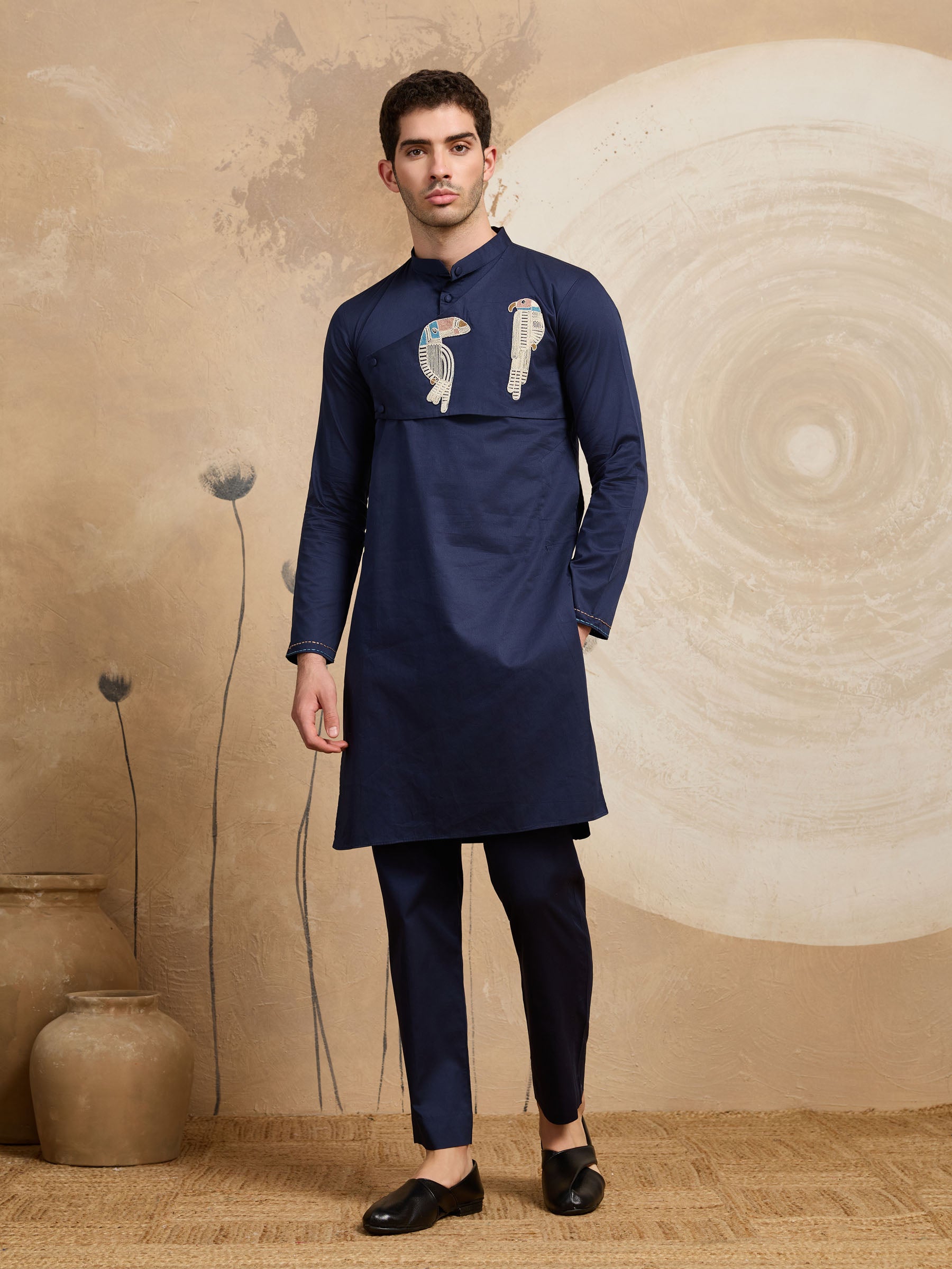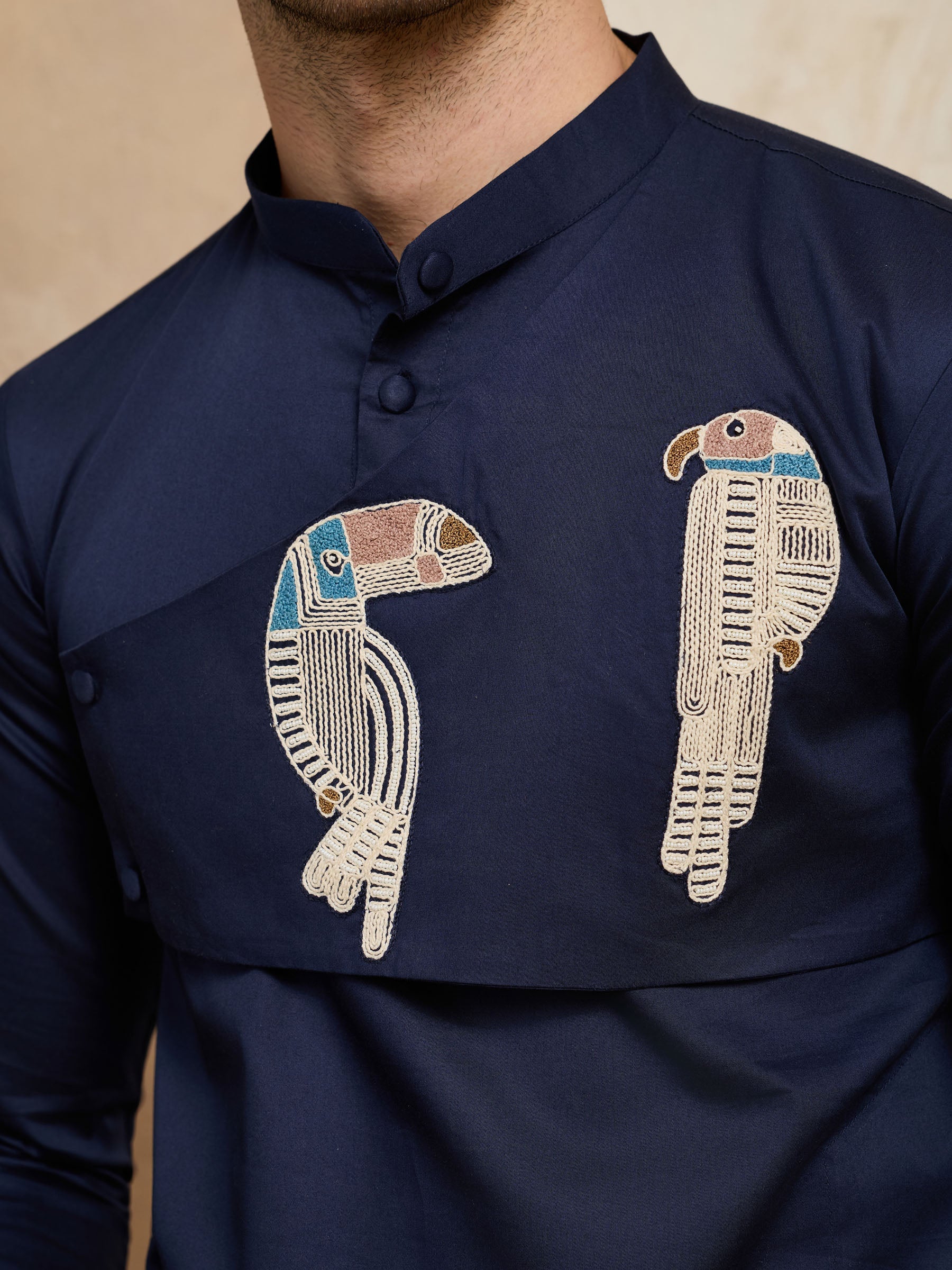 Soar in bold style with this navy giza cotton kurta, detailed with vibrant parrot embroidery for the fashion-forward spirit.