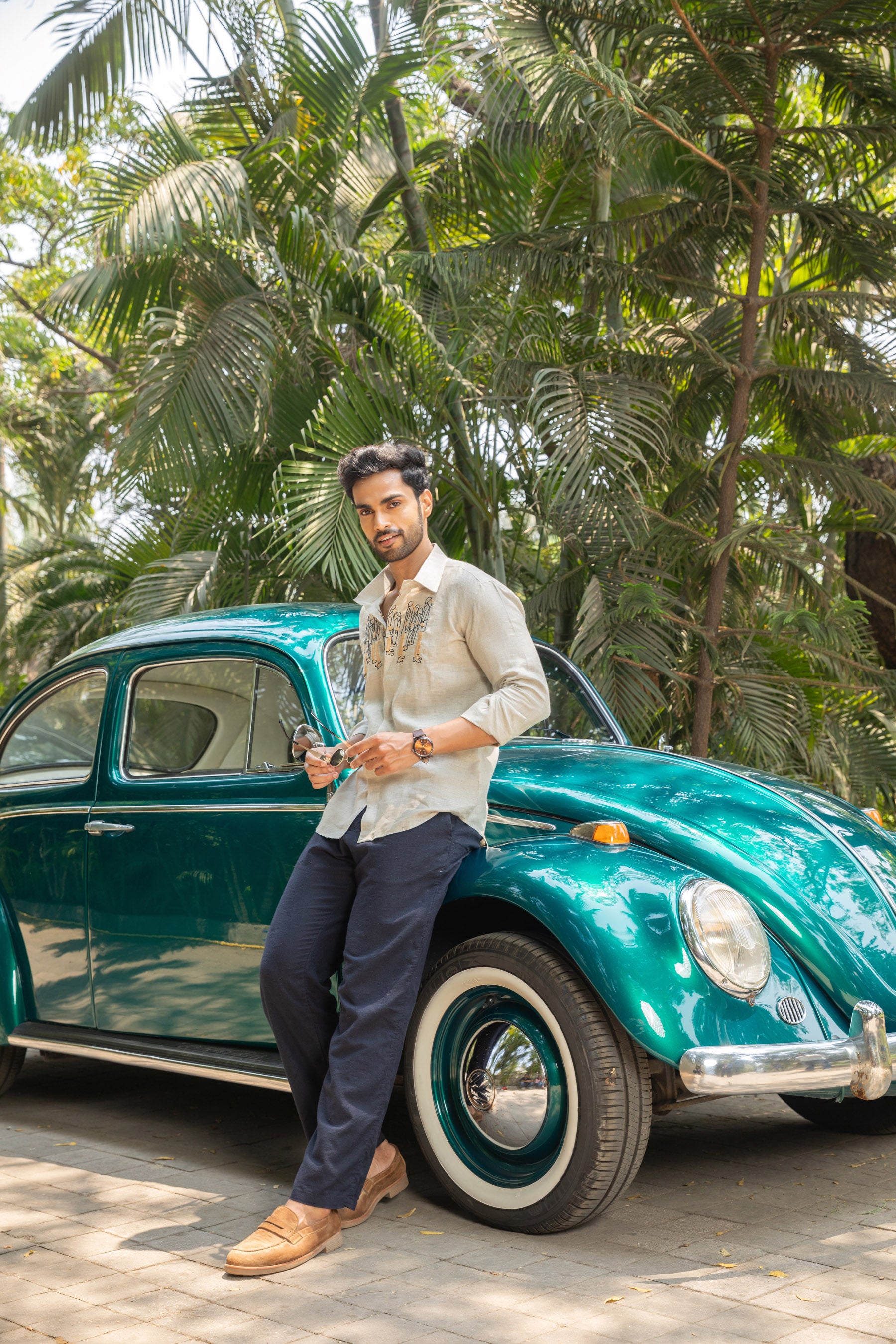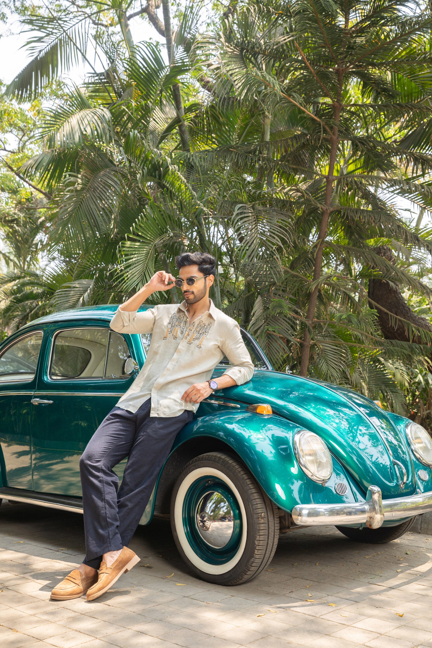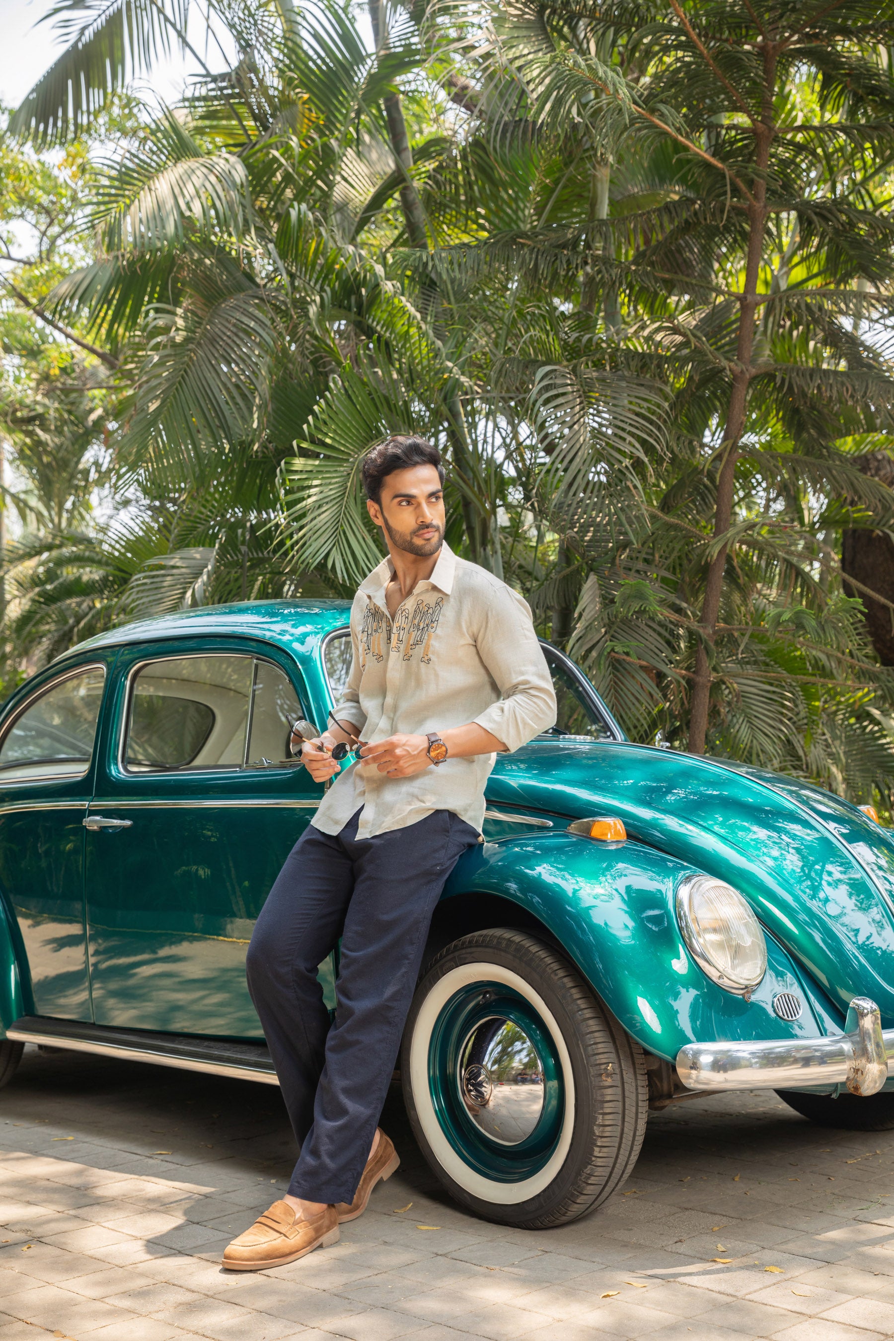 A fresh take on everyday dressing, this beige-colored linen shirt adds a pop of color while staying cool and comfortable.