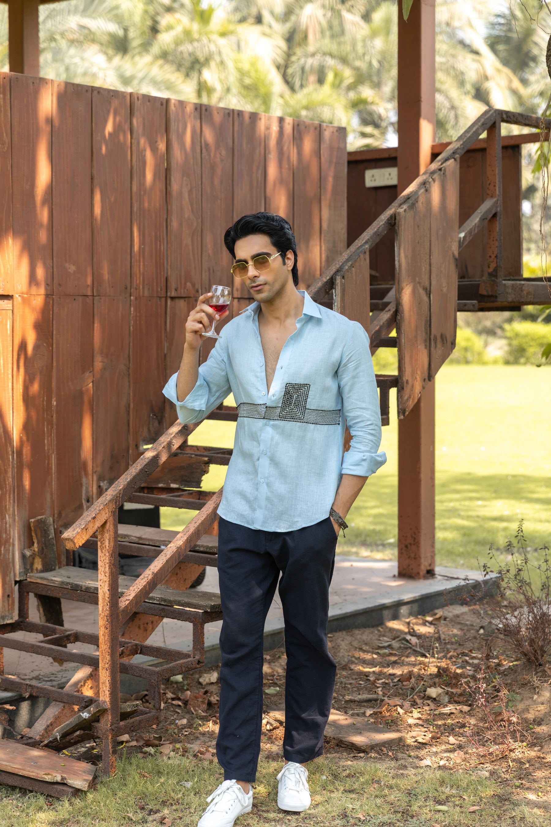 A timeless sky blue linen shirt designed for comfort and elegance. Perfect for travel, brunches, or summer evenings.