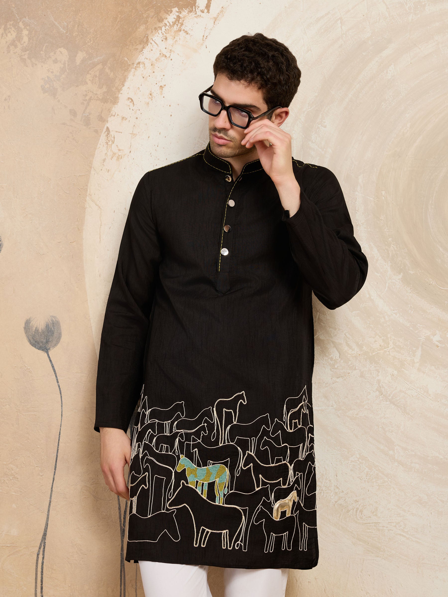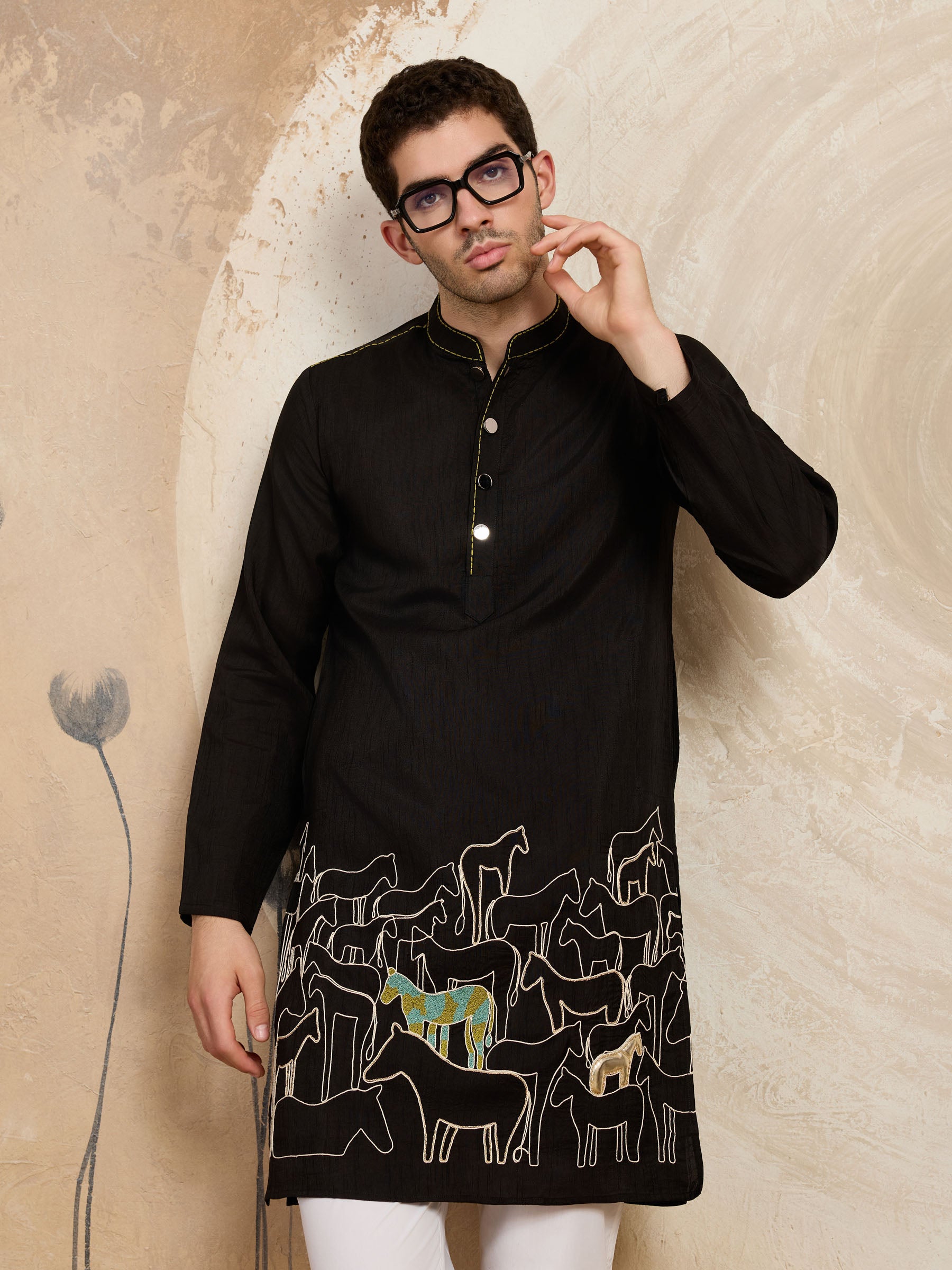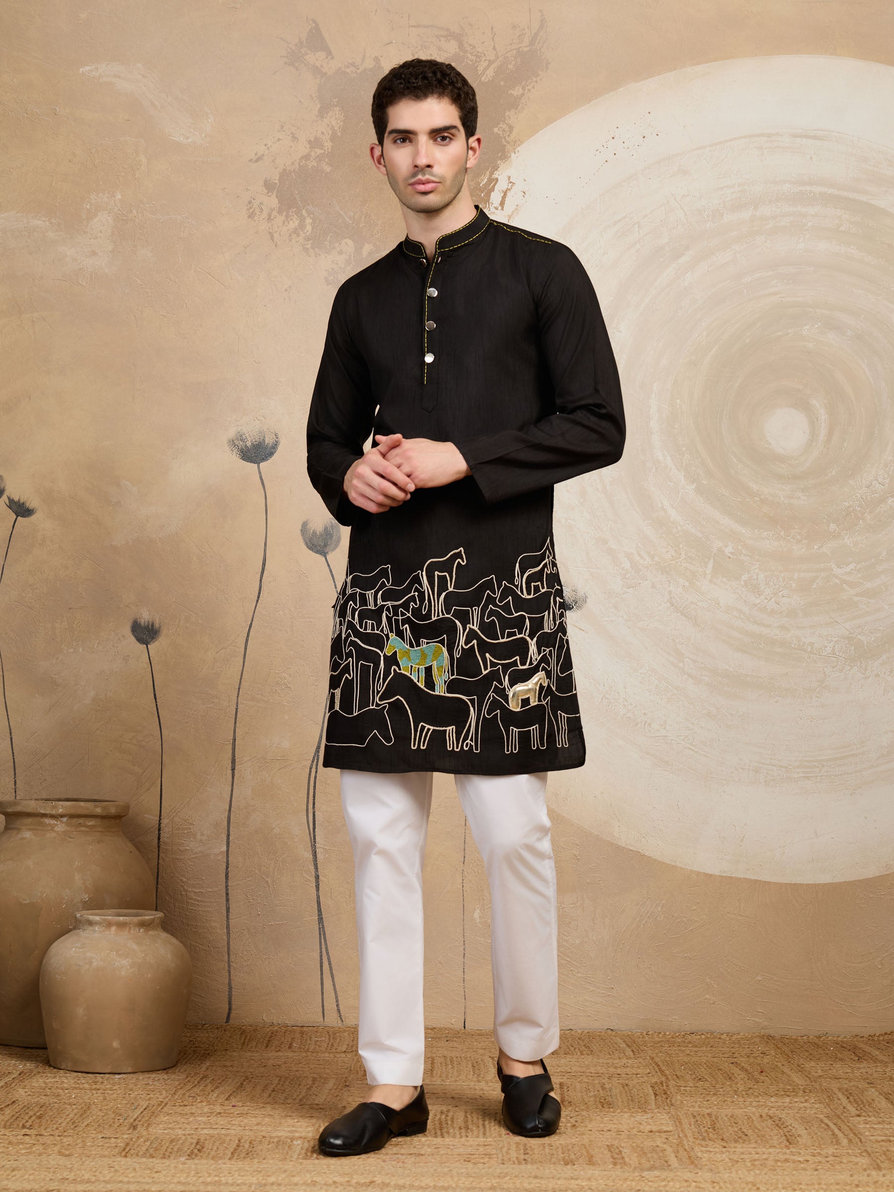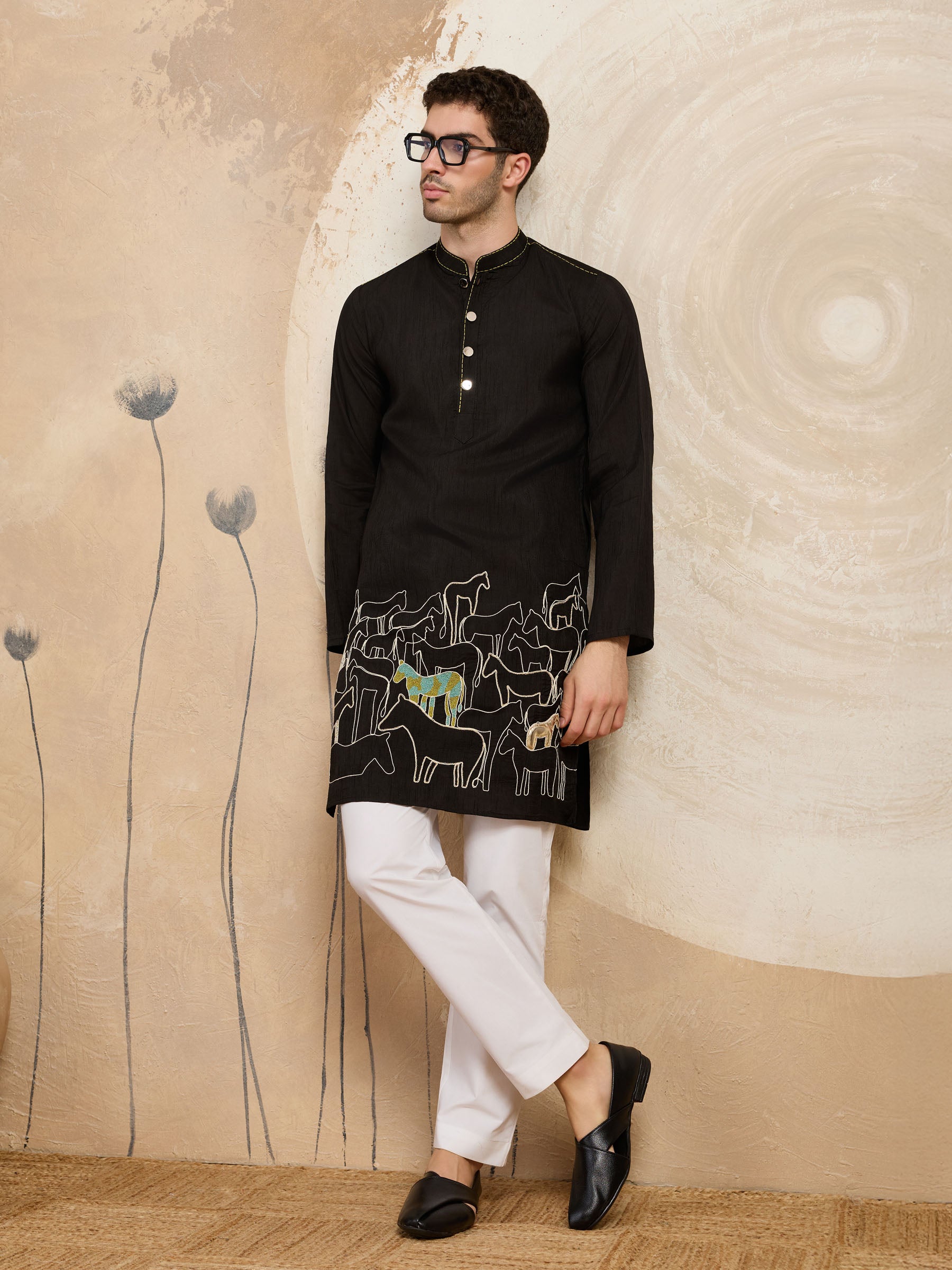 Heritage charm meets modern tailoring in this refined raw silk kurta, detailed with an elegant horse motif for timeless appeal.
