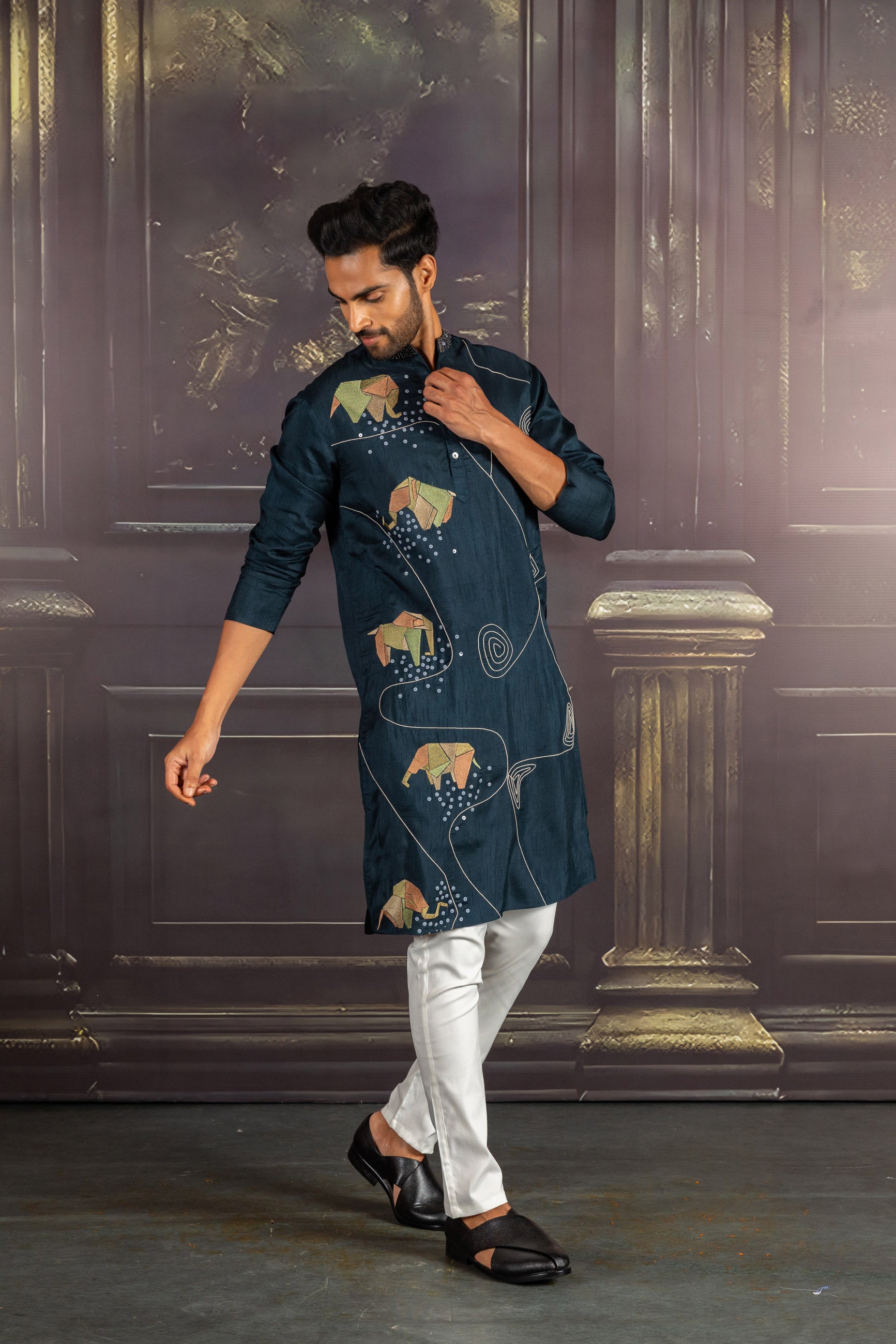 A deep bottle green kurta crafted in silk. Elegant and understated, perfect for both festive occasions and everyday traditional wear.
