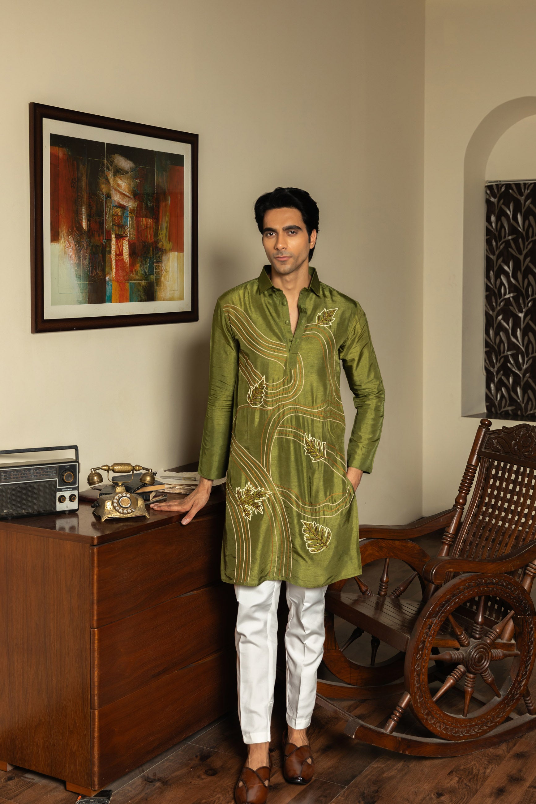 Crafted from silk, this mehendi green kurta features a straight cut for a clean and modern look. Ideal for everyday wear or casual gatherings.