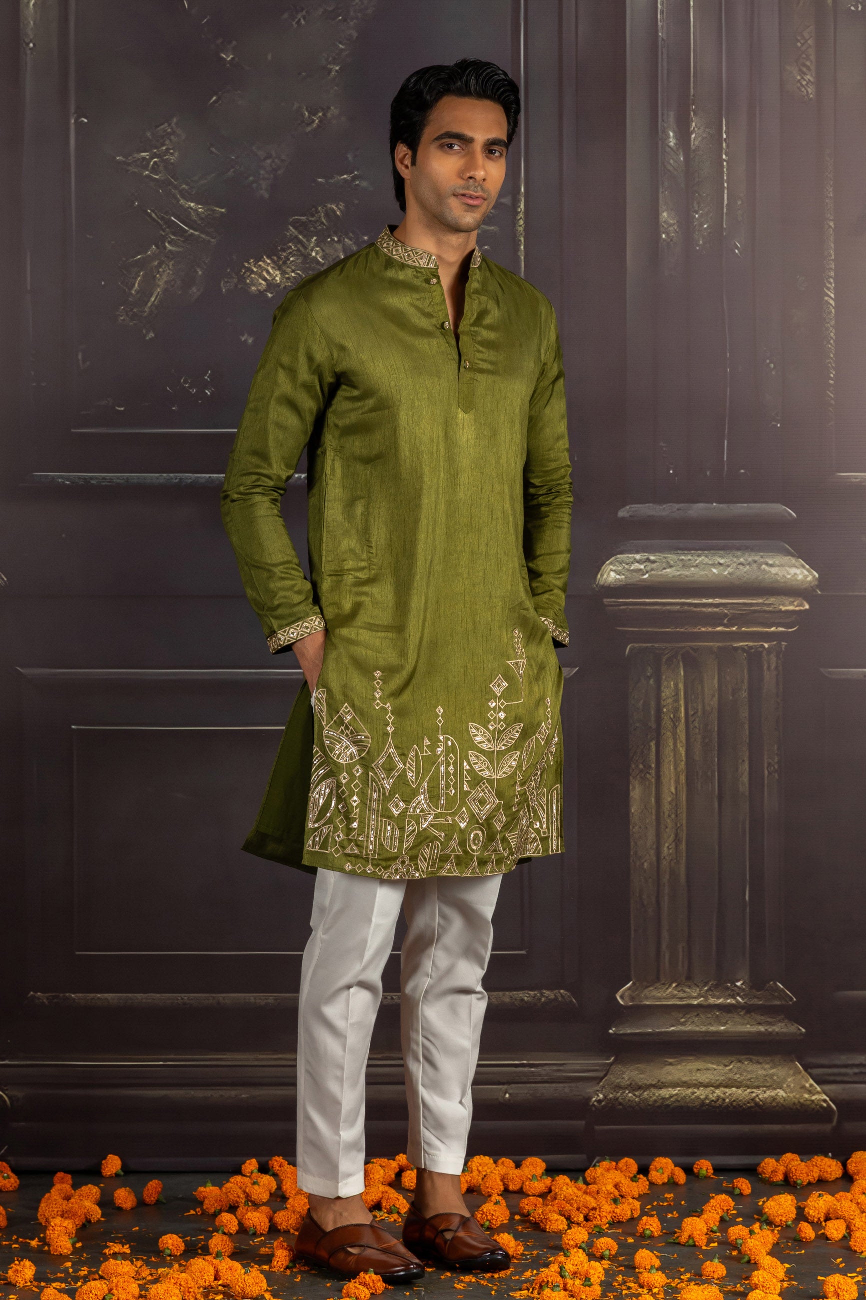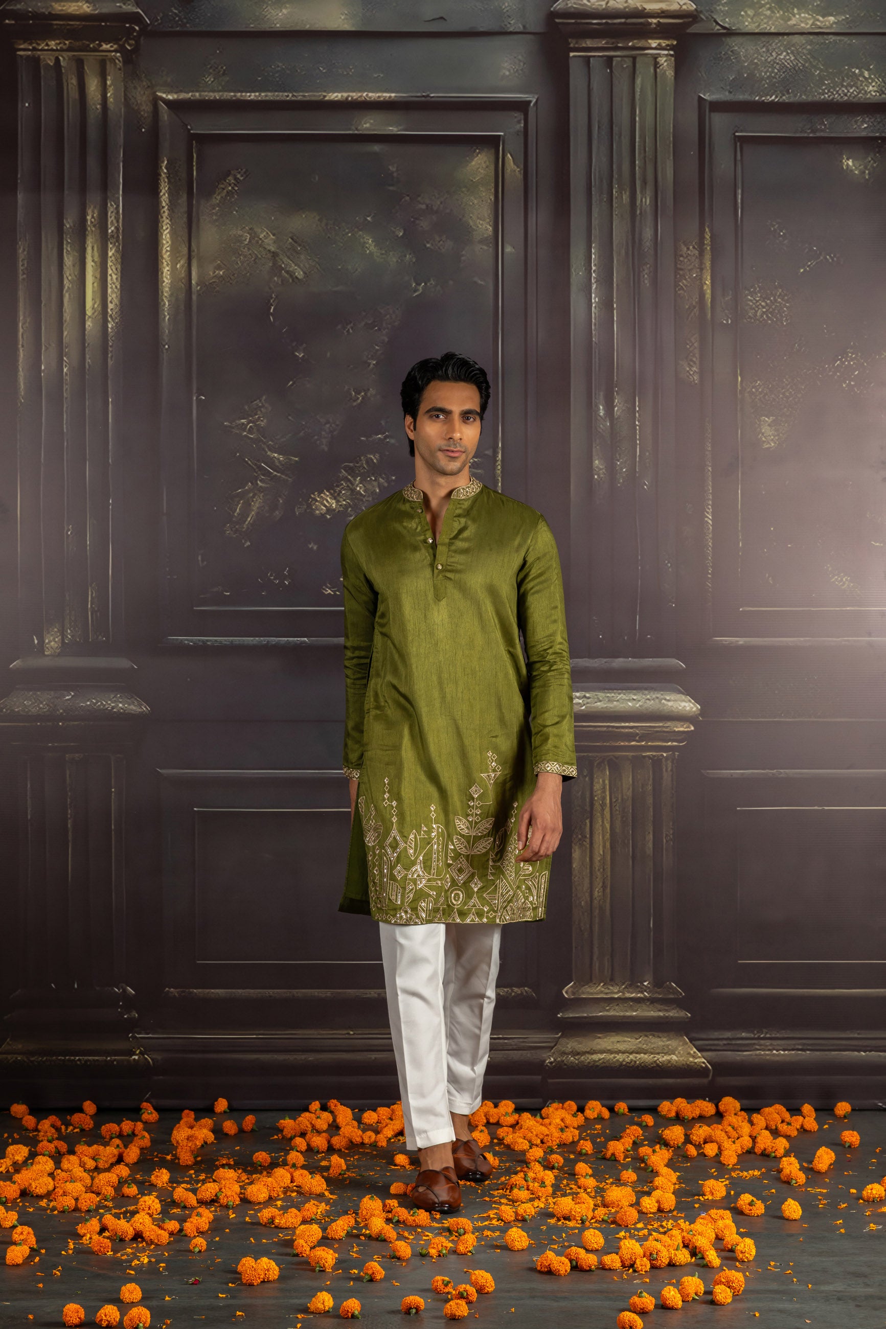 This mehendi green silk kurta offers a relaxed yet structured straight fit, designed for ease of movement and a polished appearance. Versatile for any occasion.