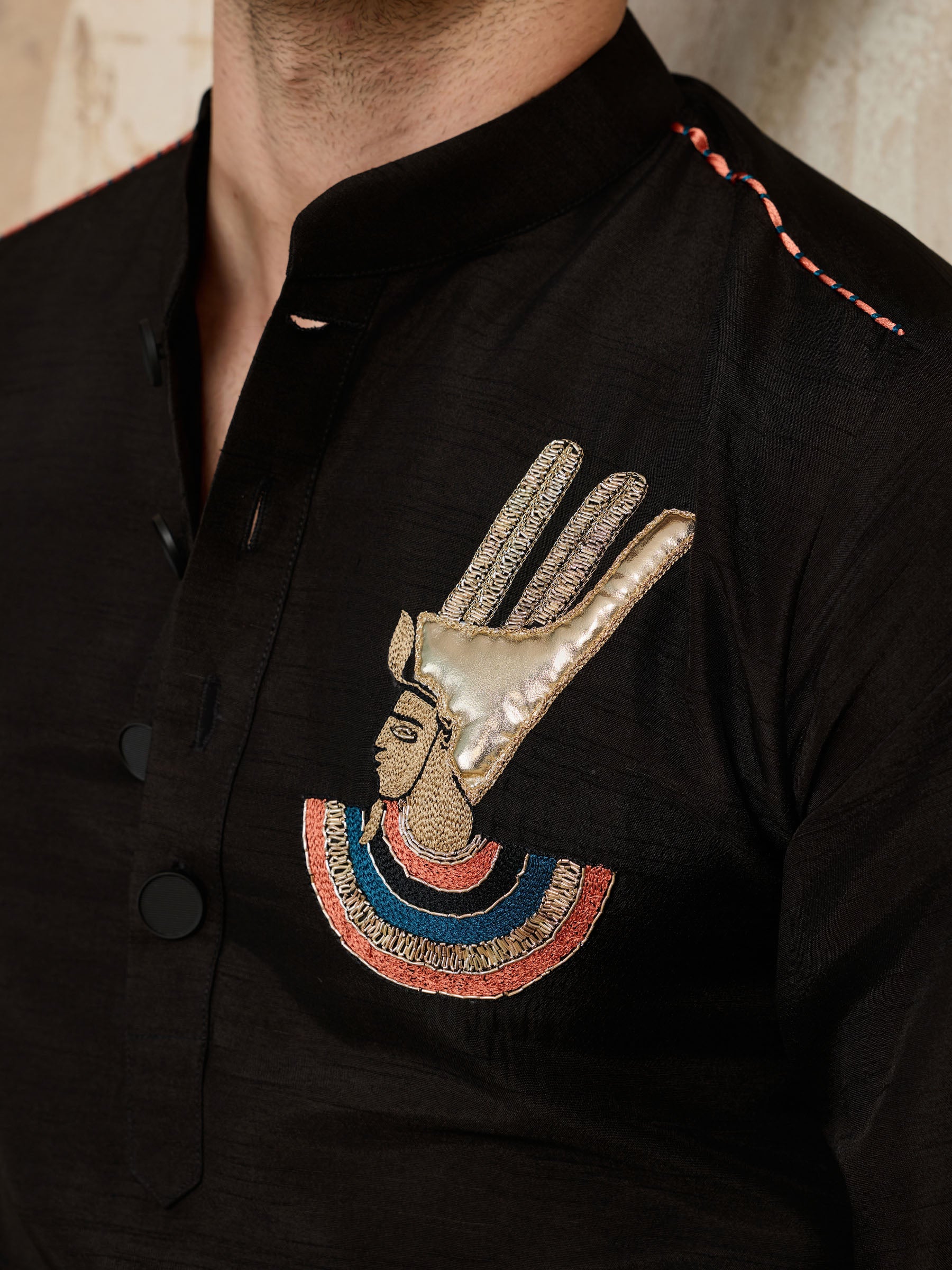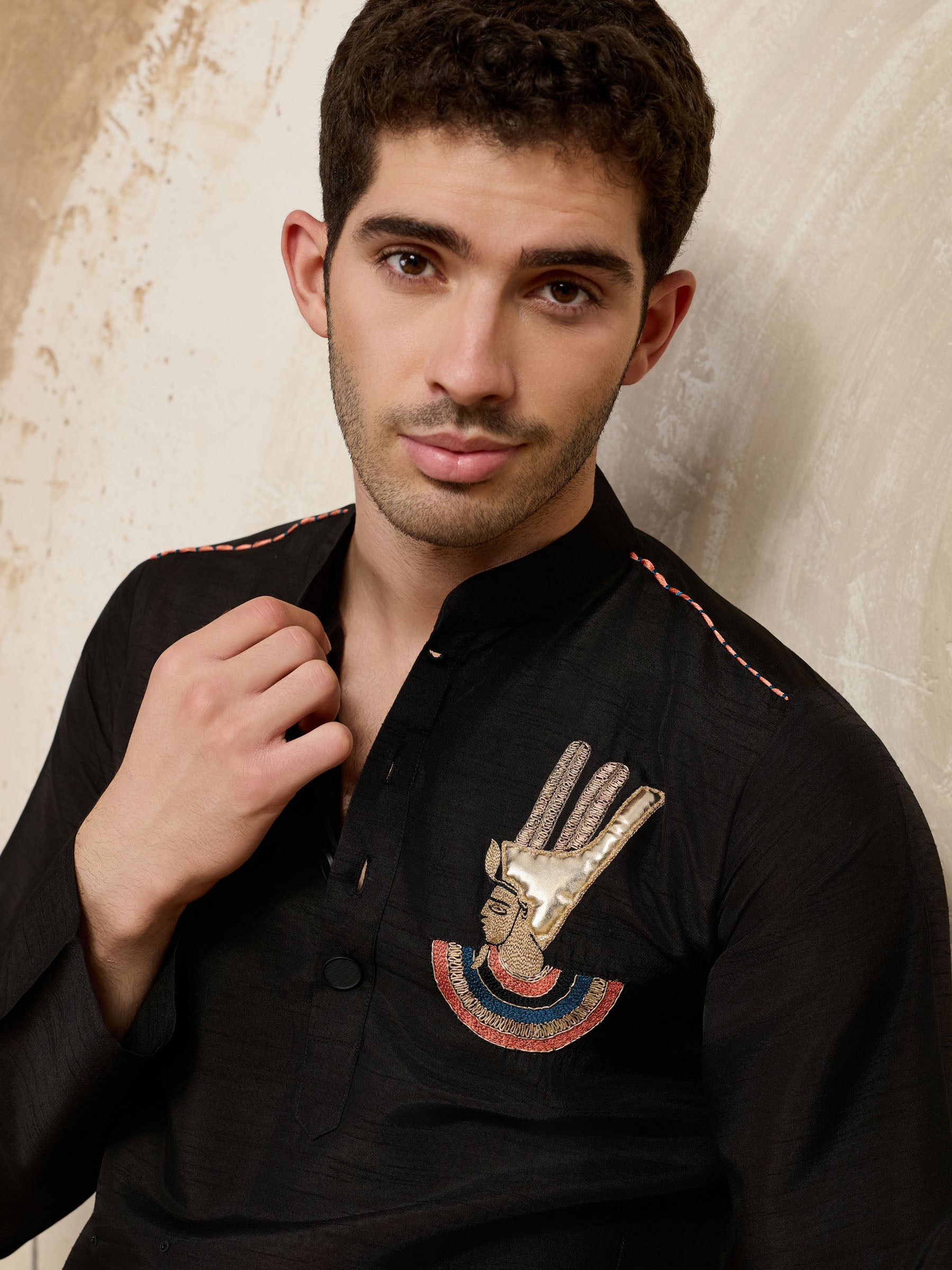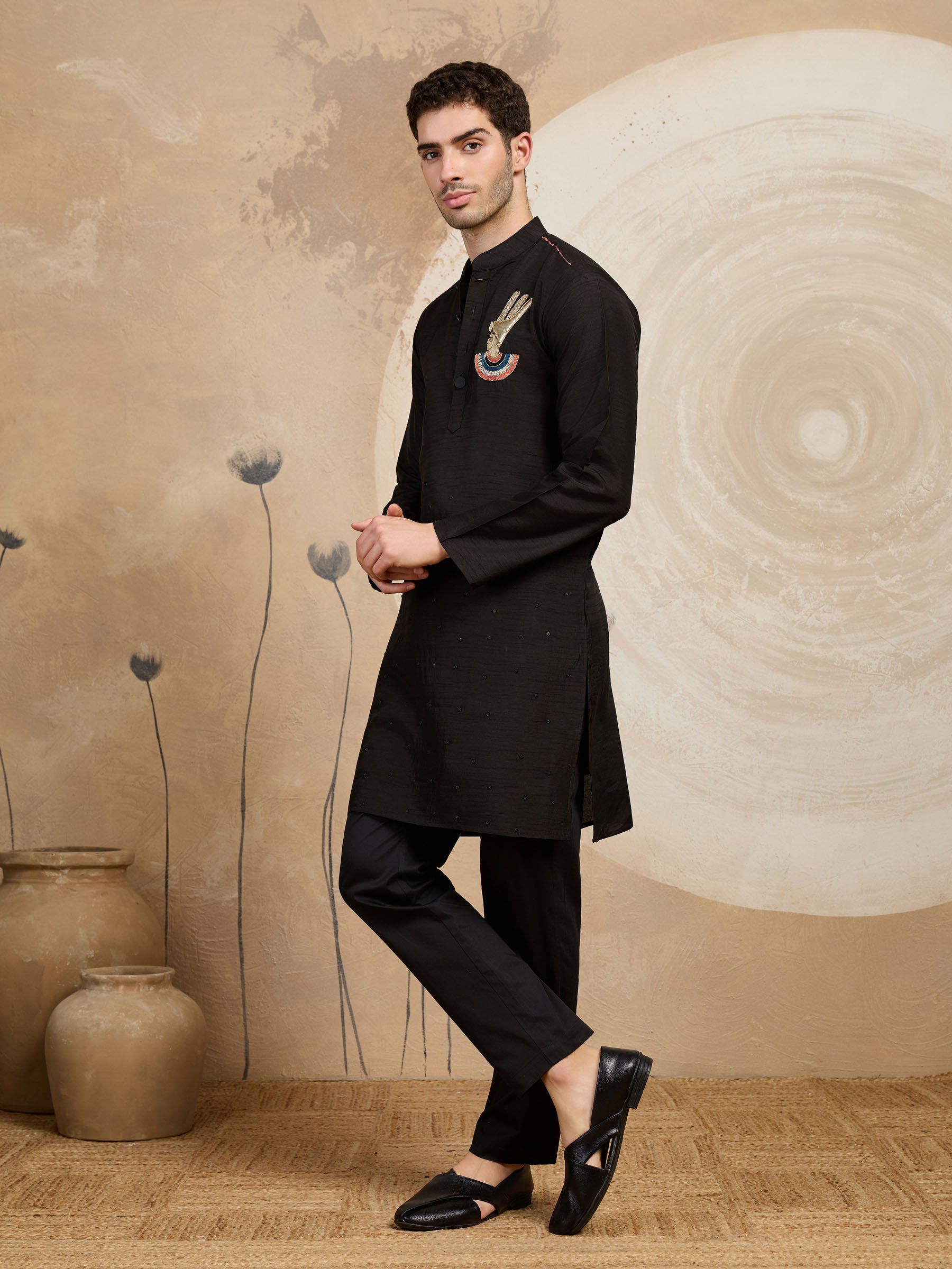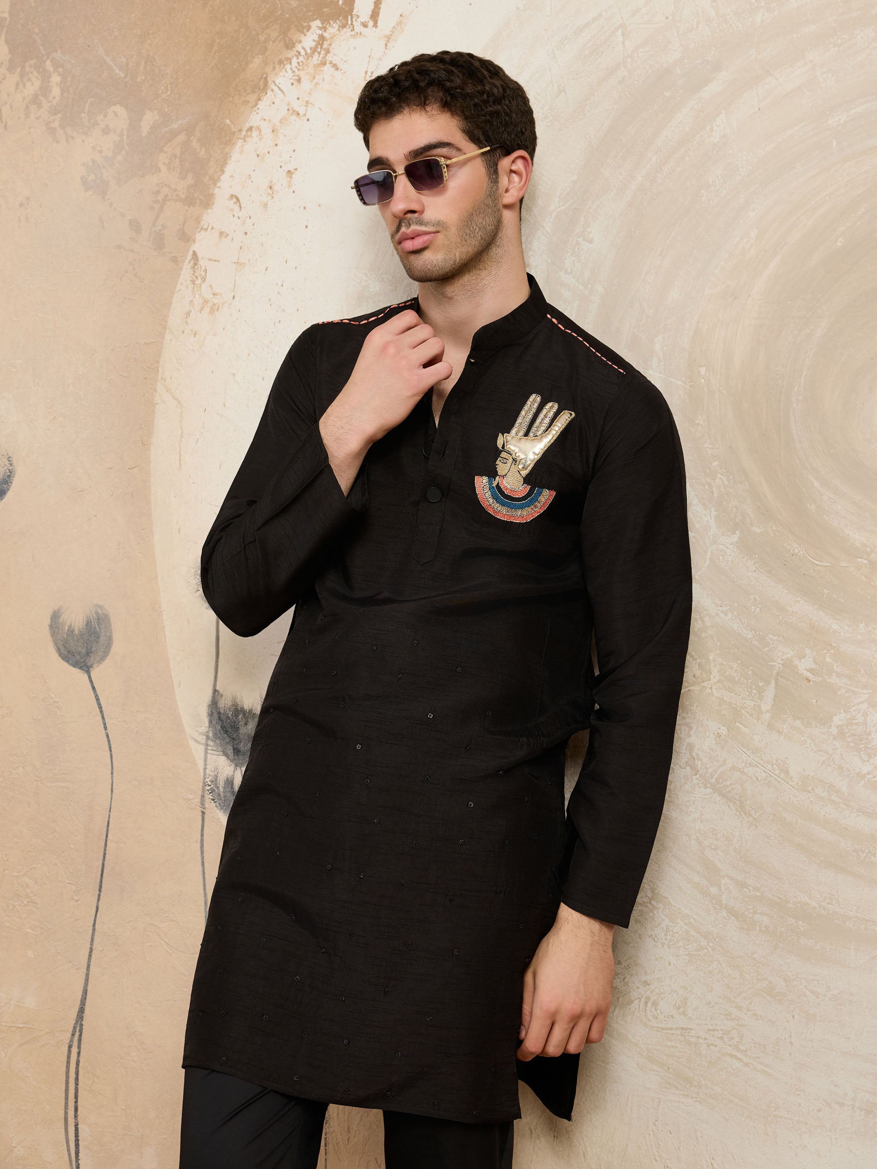 Command attention in this regal flat silk kurta, crowned with a bold king-inspired motif for those who own every room they walk into.
