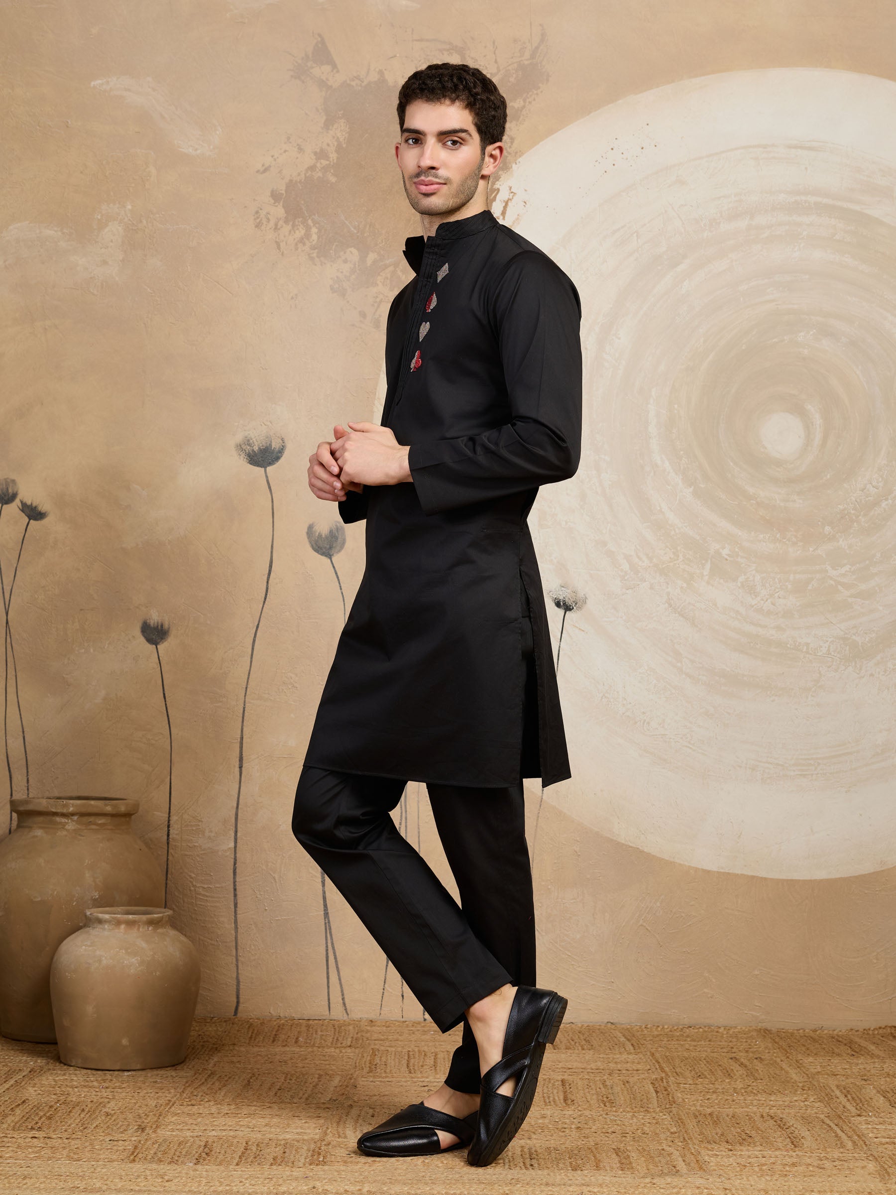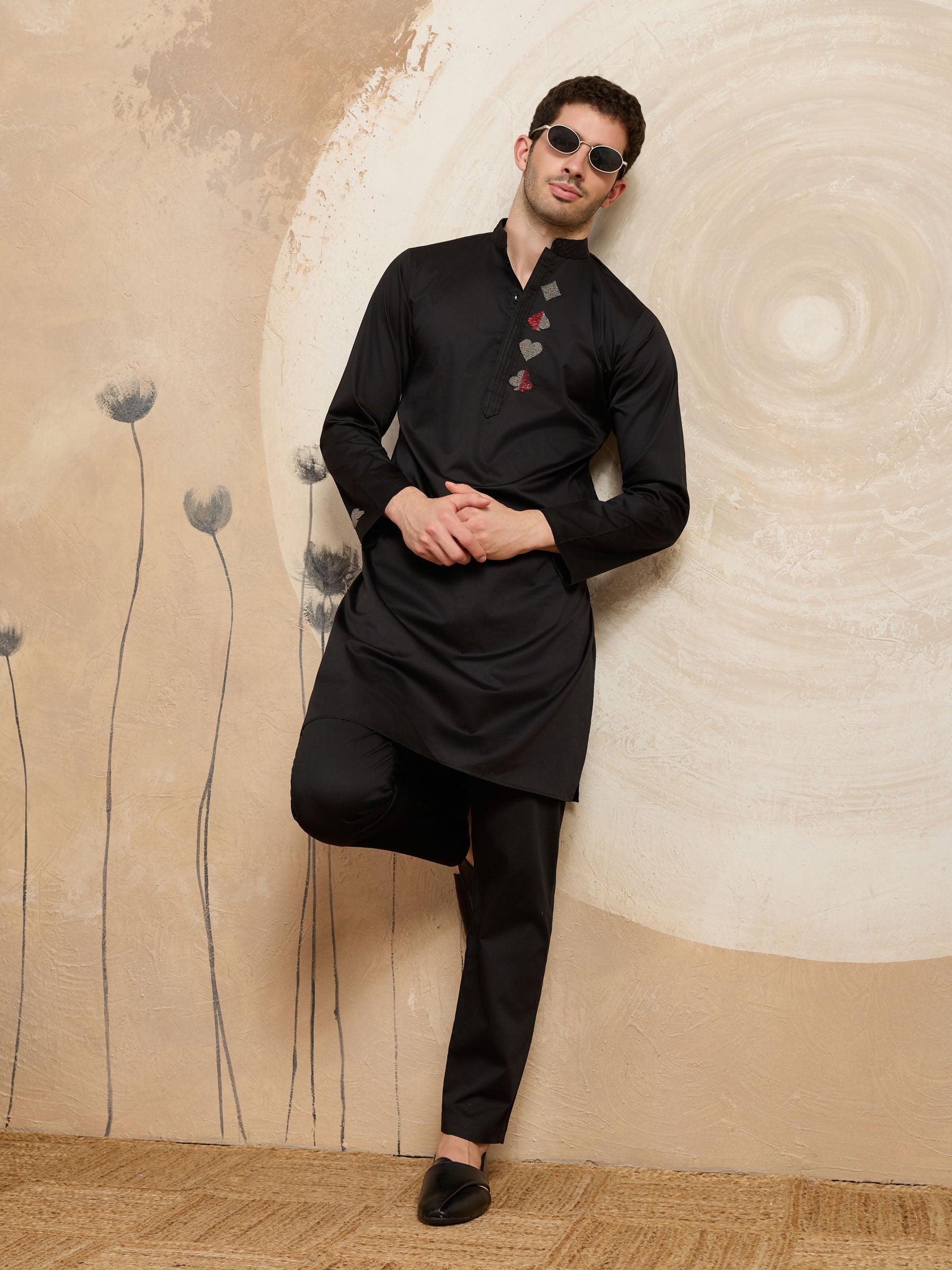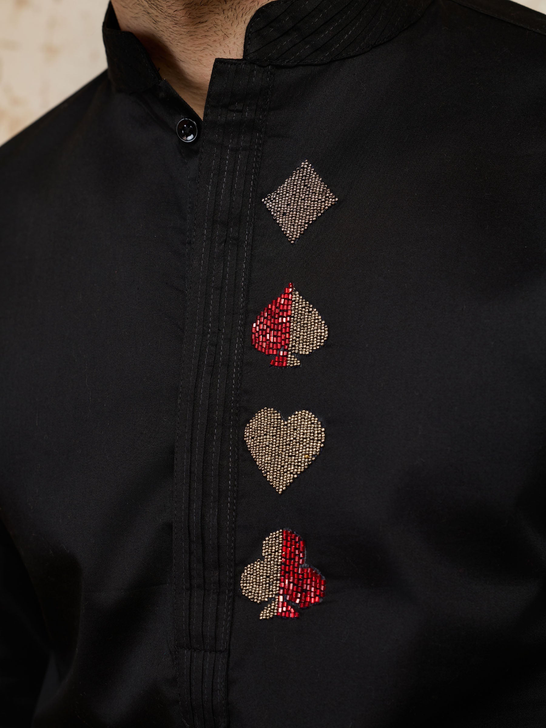Make your move in this striking black giza cotton kurta, finished with a smart card-print motif for a look that’s always ahead of the game.