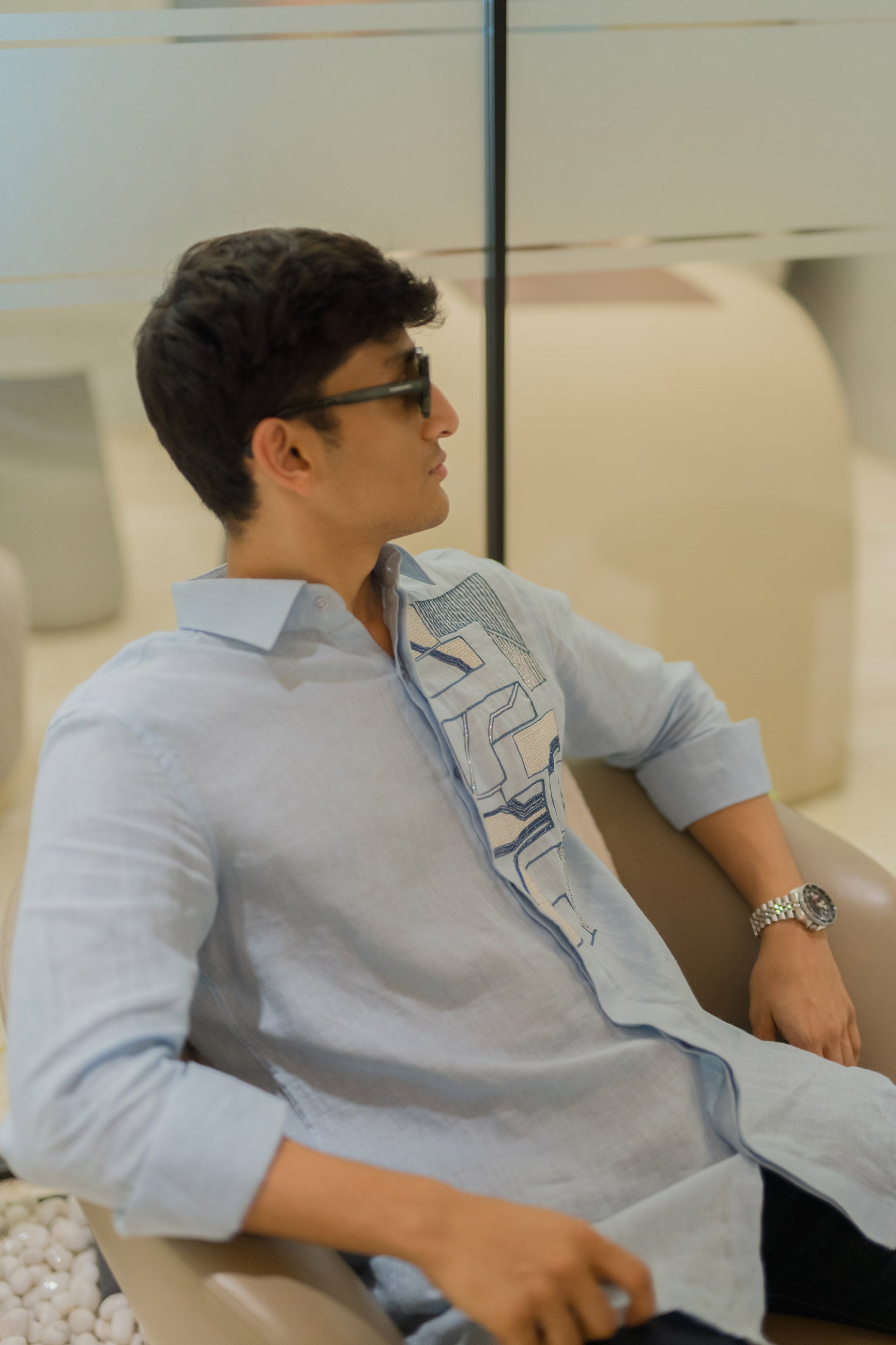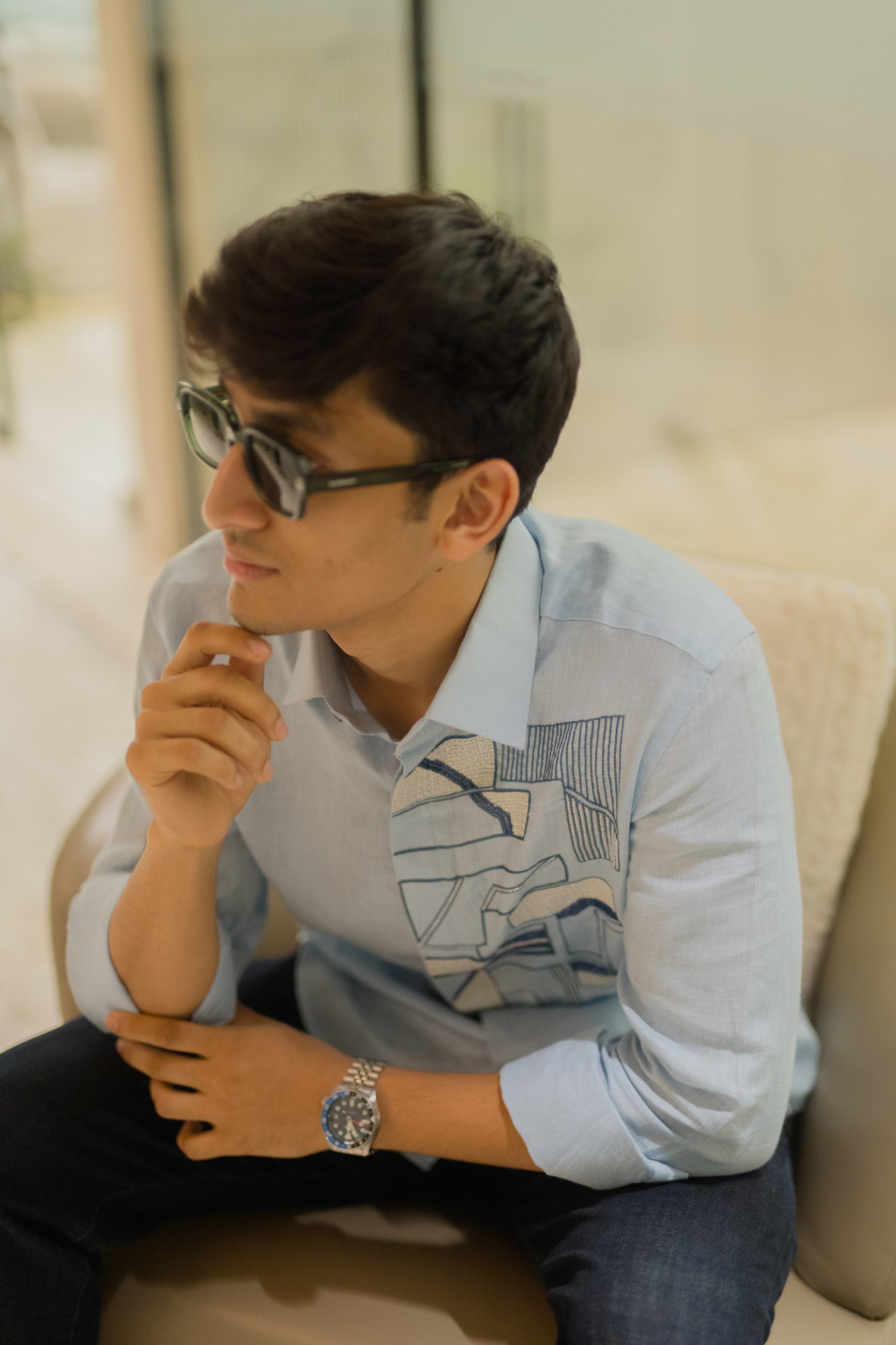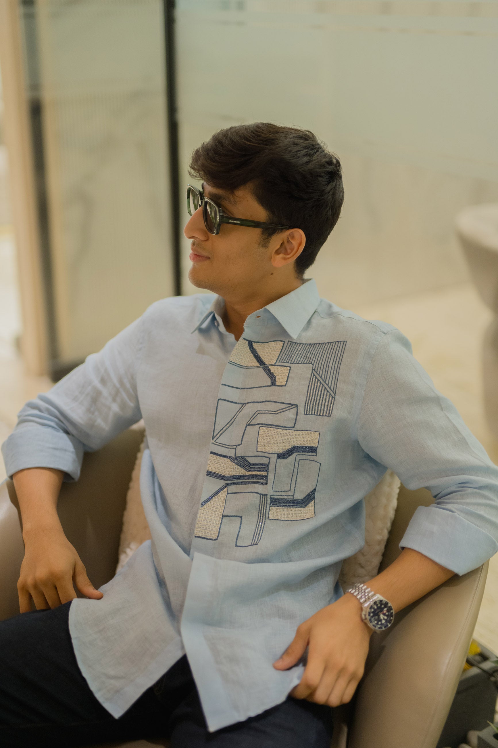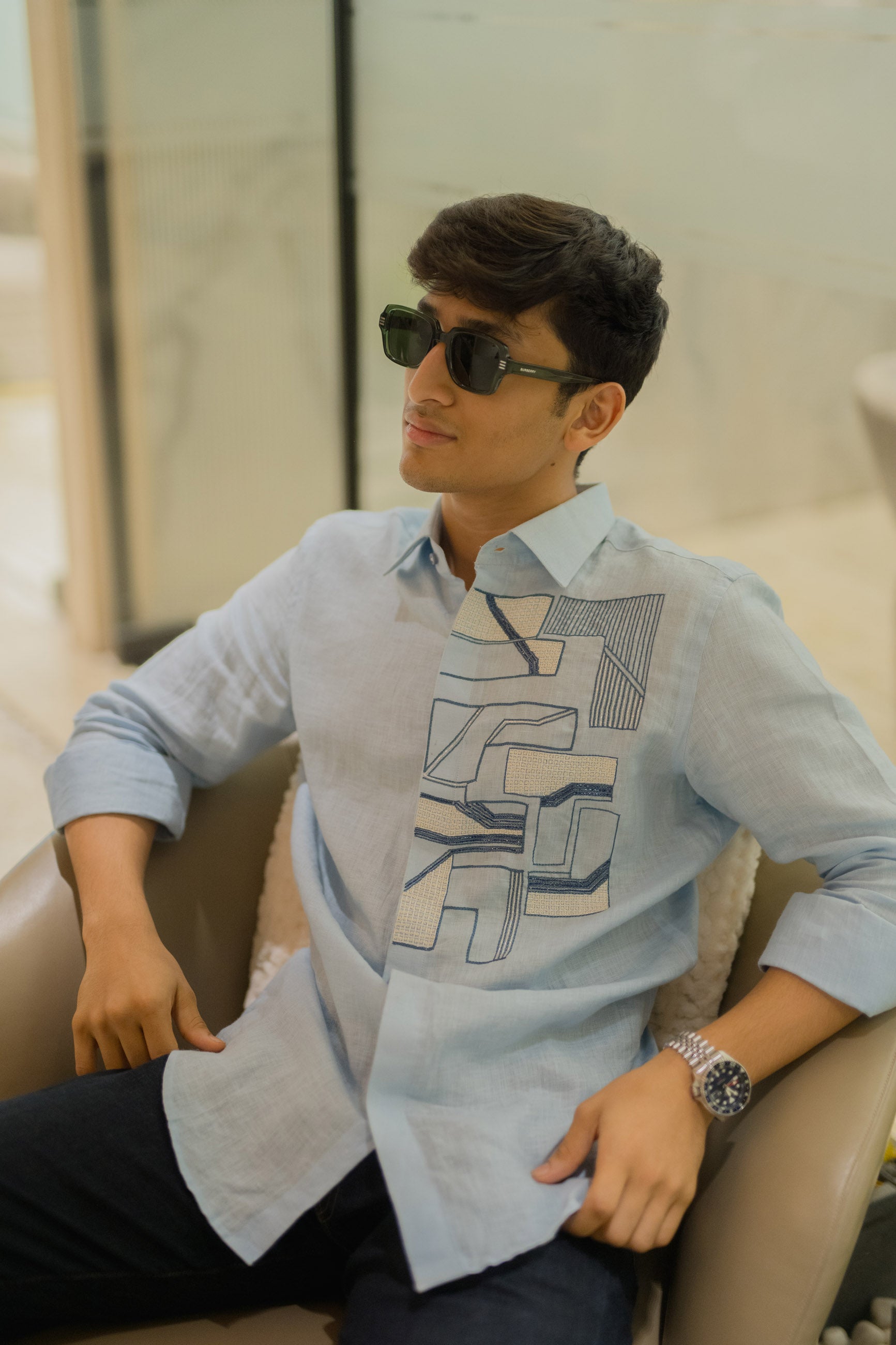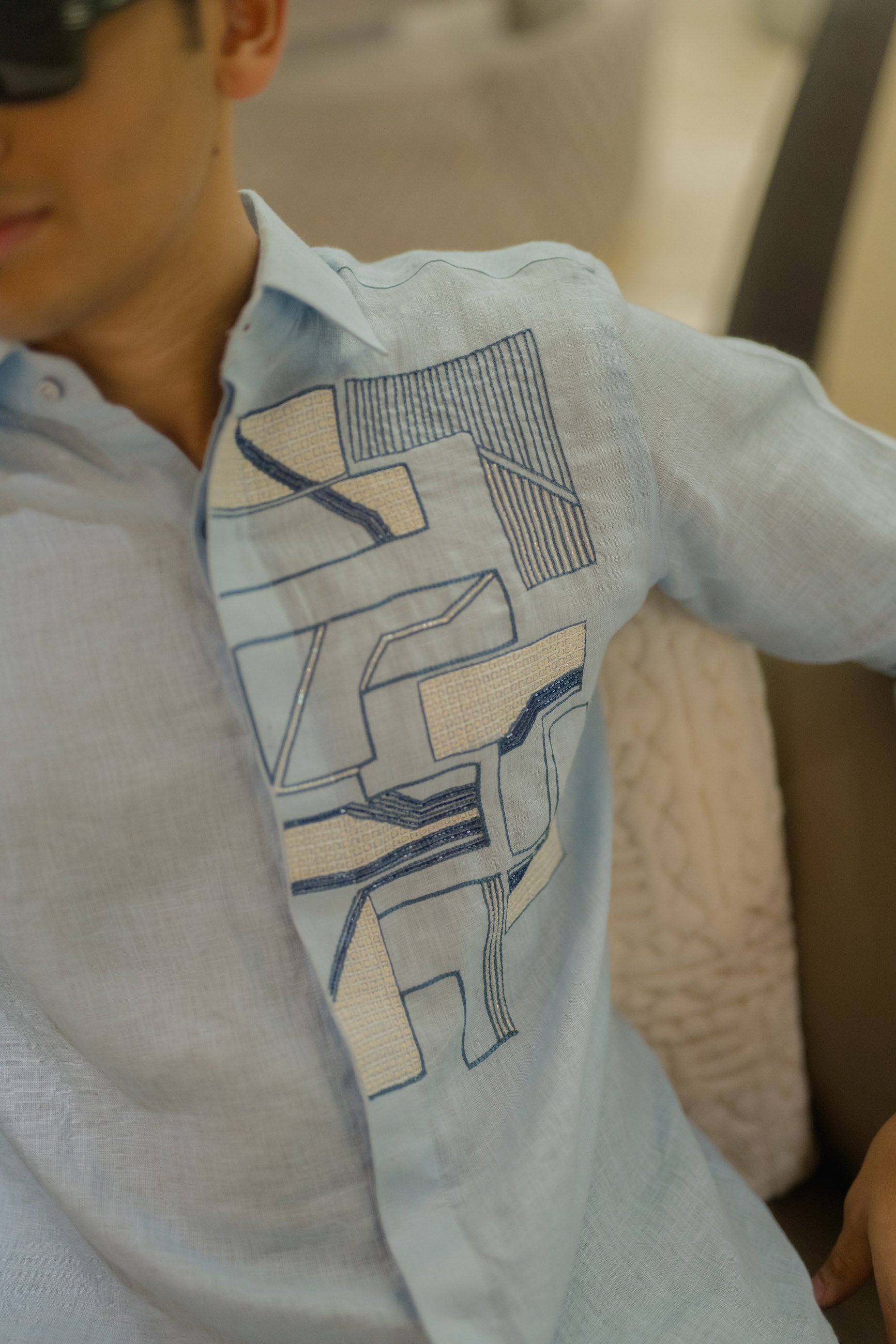 With its flowing abstract art on breathable linen, this blue shirt is a canvas of creativity, made to stand out.