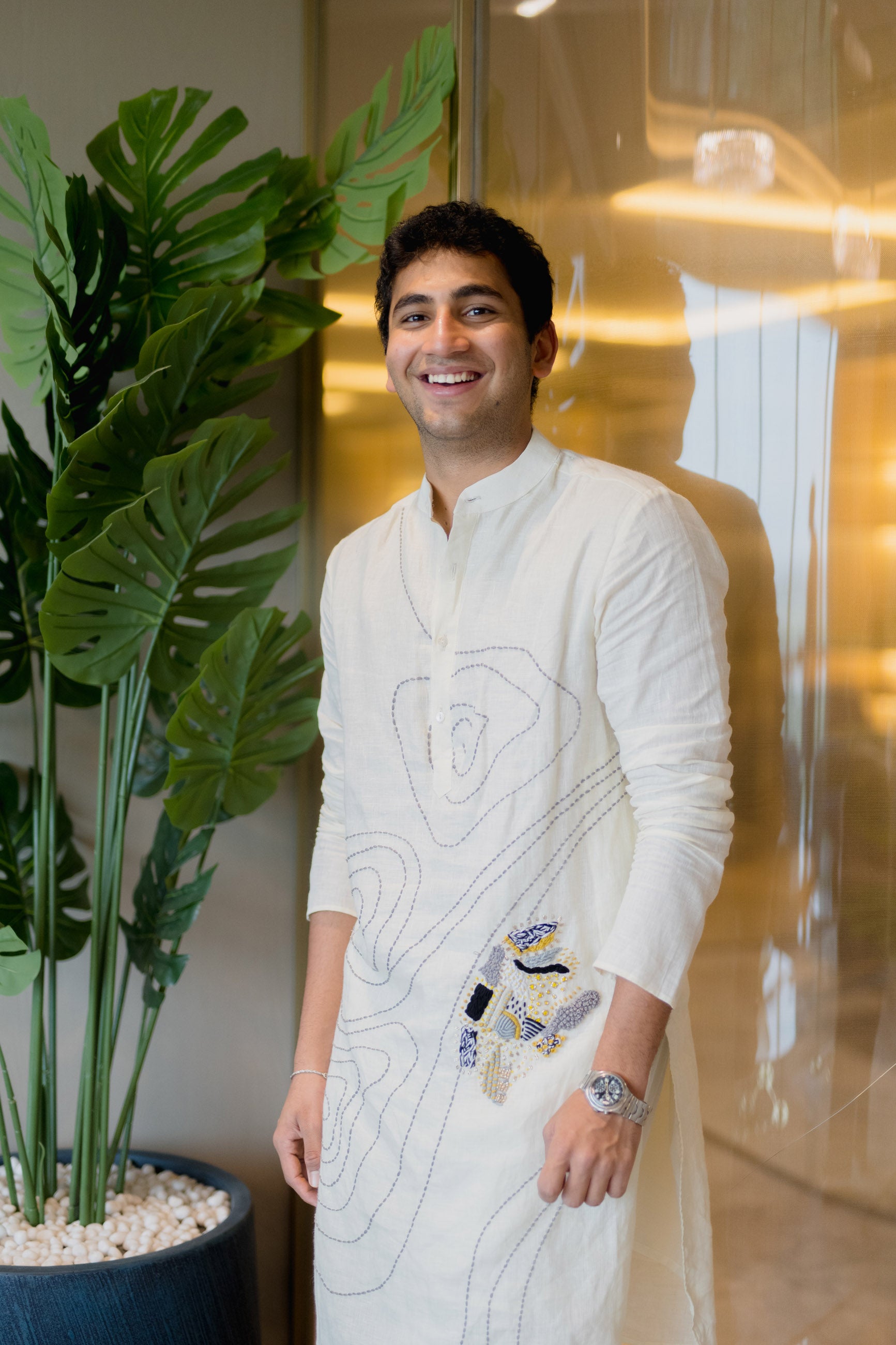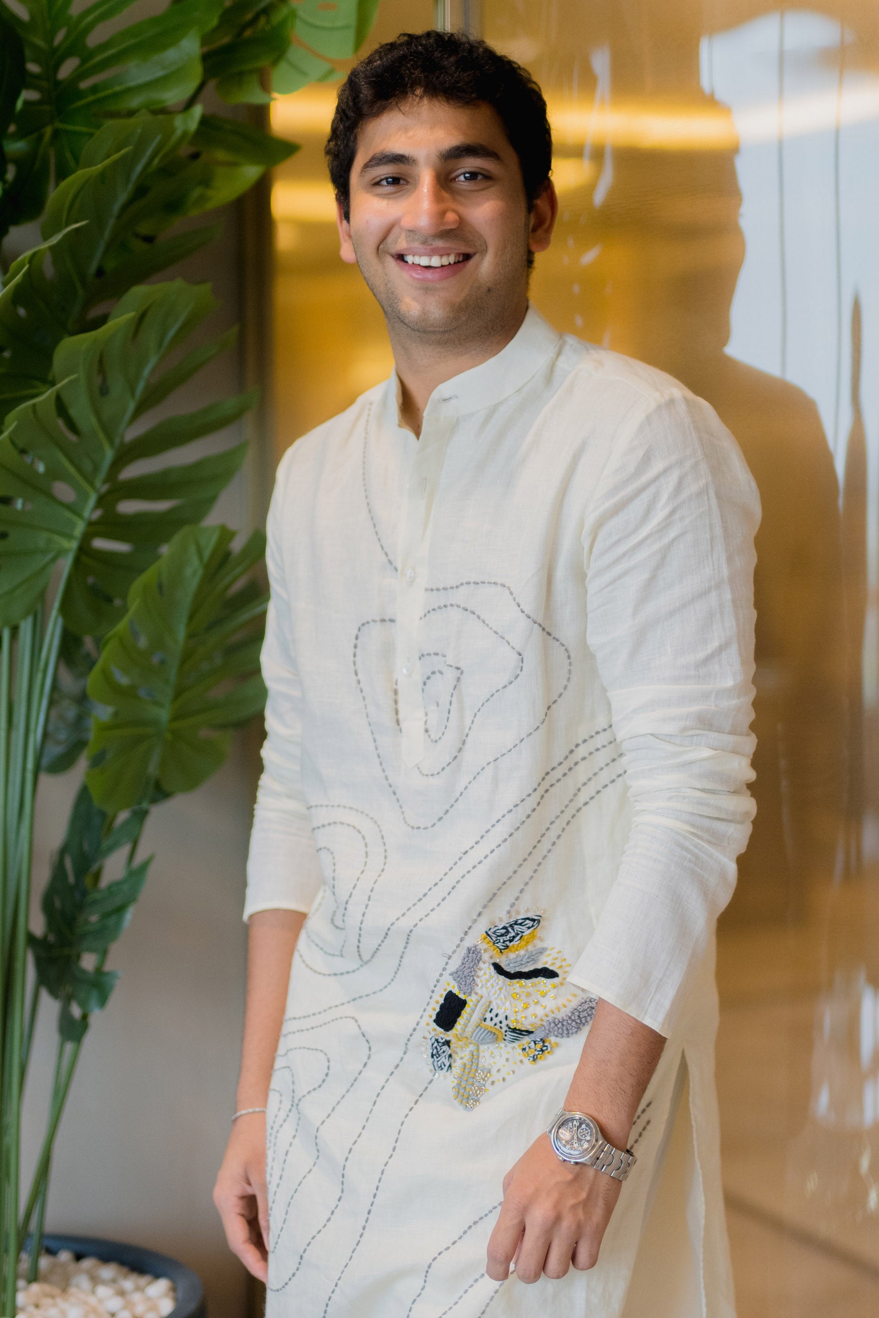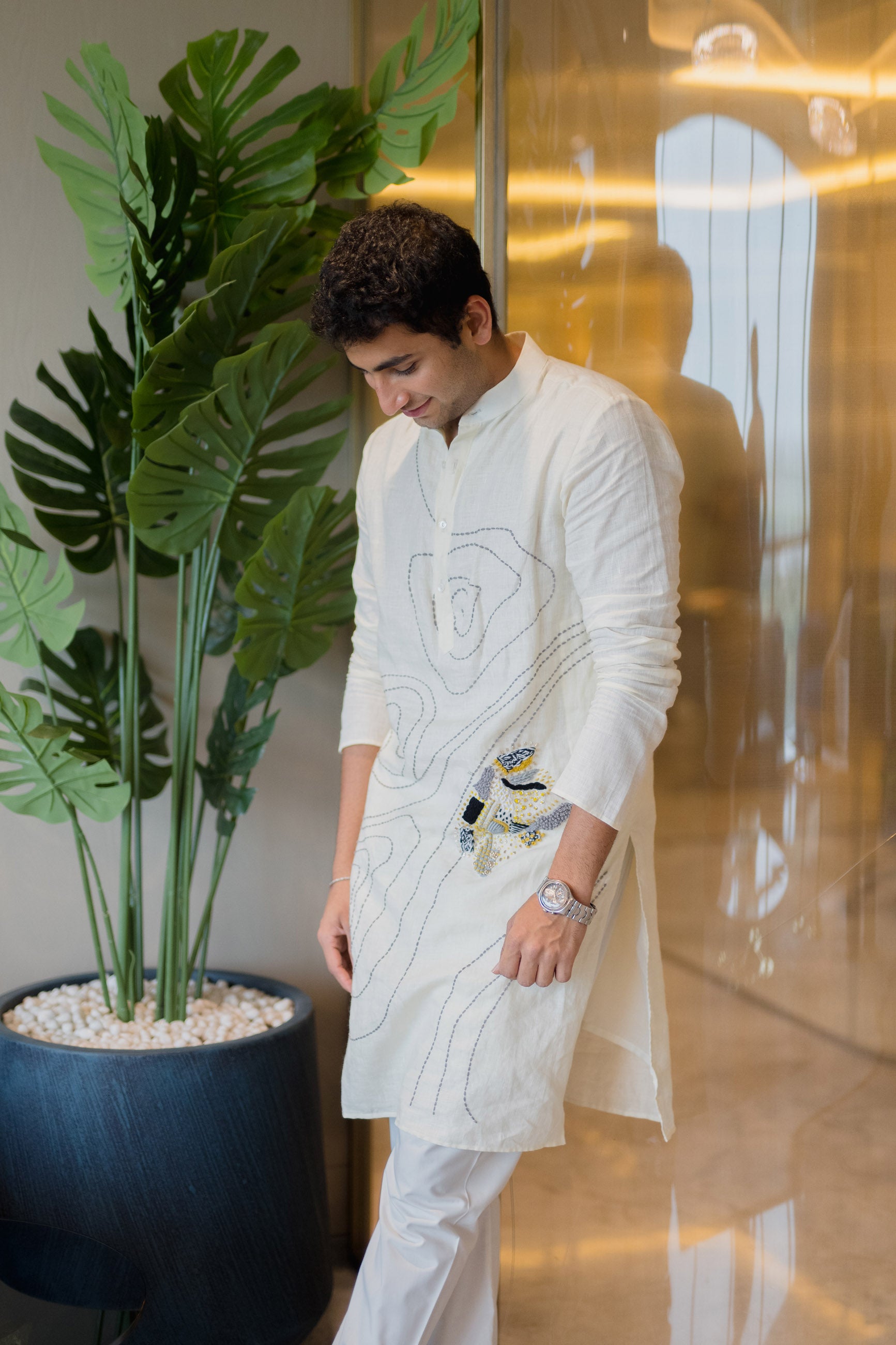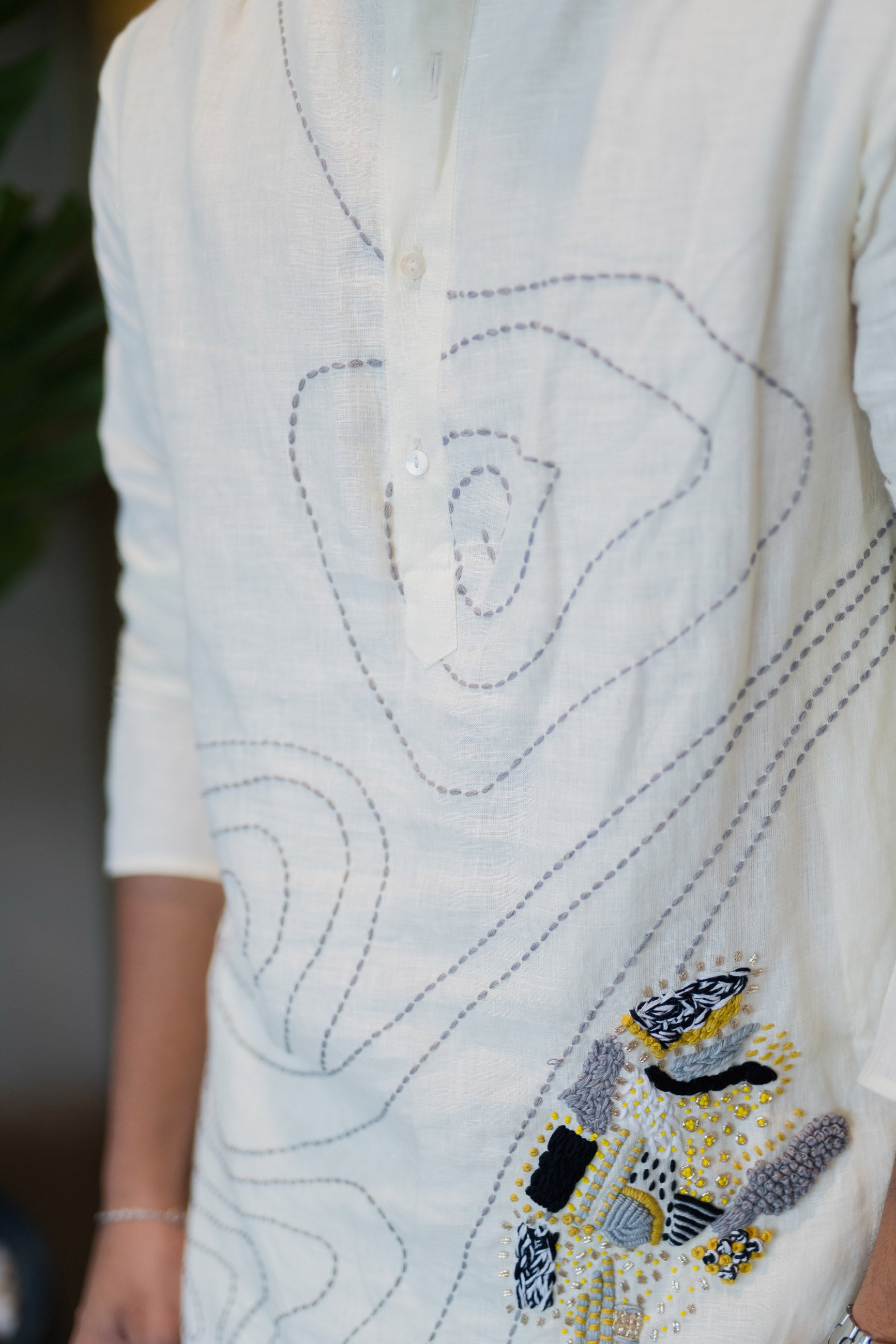 Minimalist yet expressive, this white linen kurta with abstract detailing is a modern essential for cultured wardrobes.