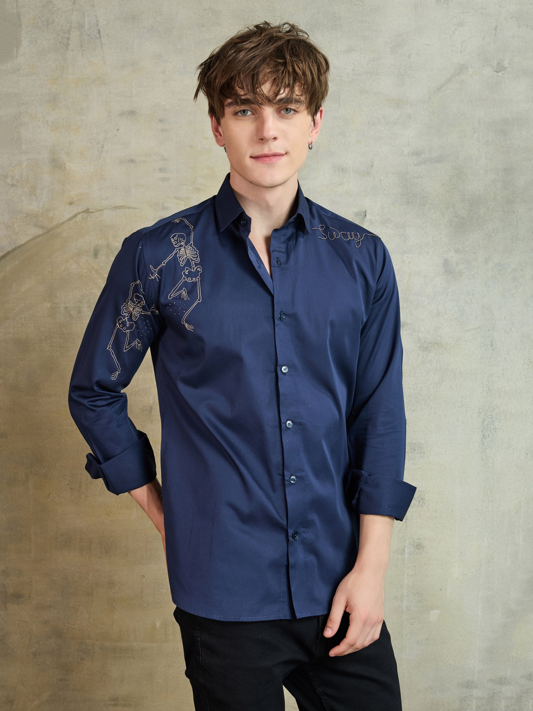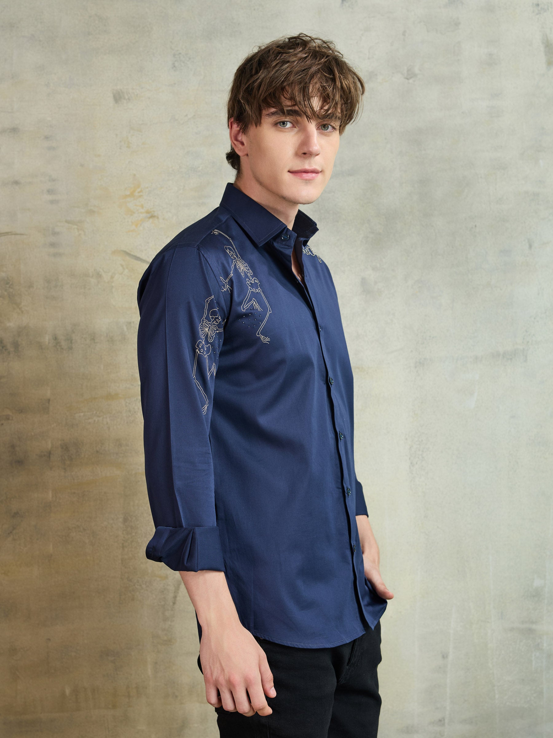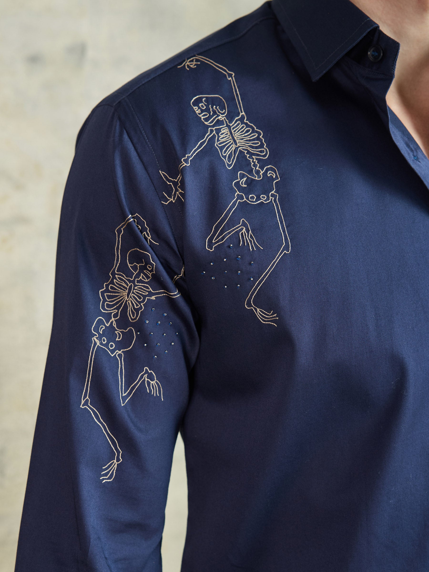 Tailored in pure cotton, this blue shirt stands out with its playful skeleton graphic. A contemporary piece for the bold and style-forward dresser.