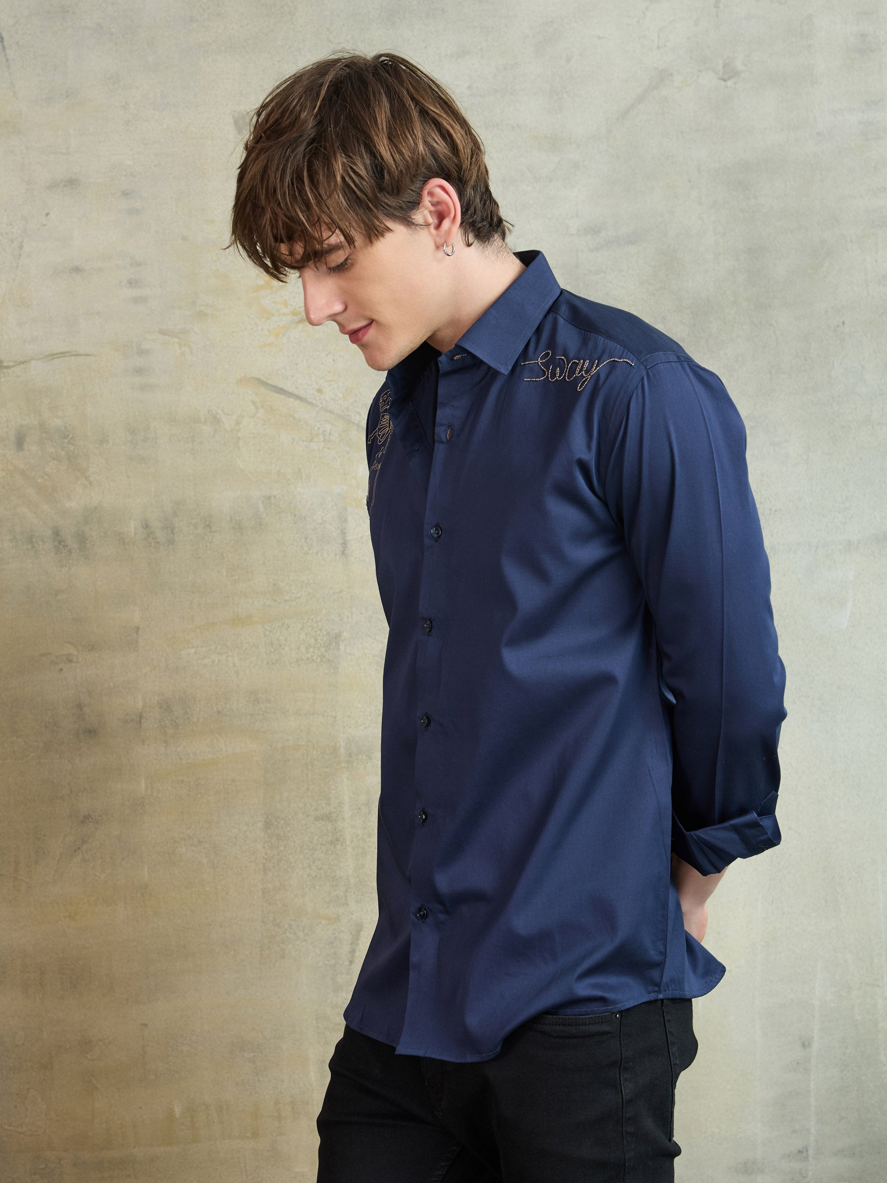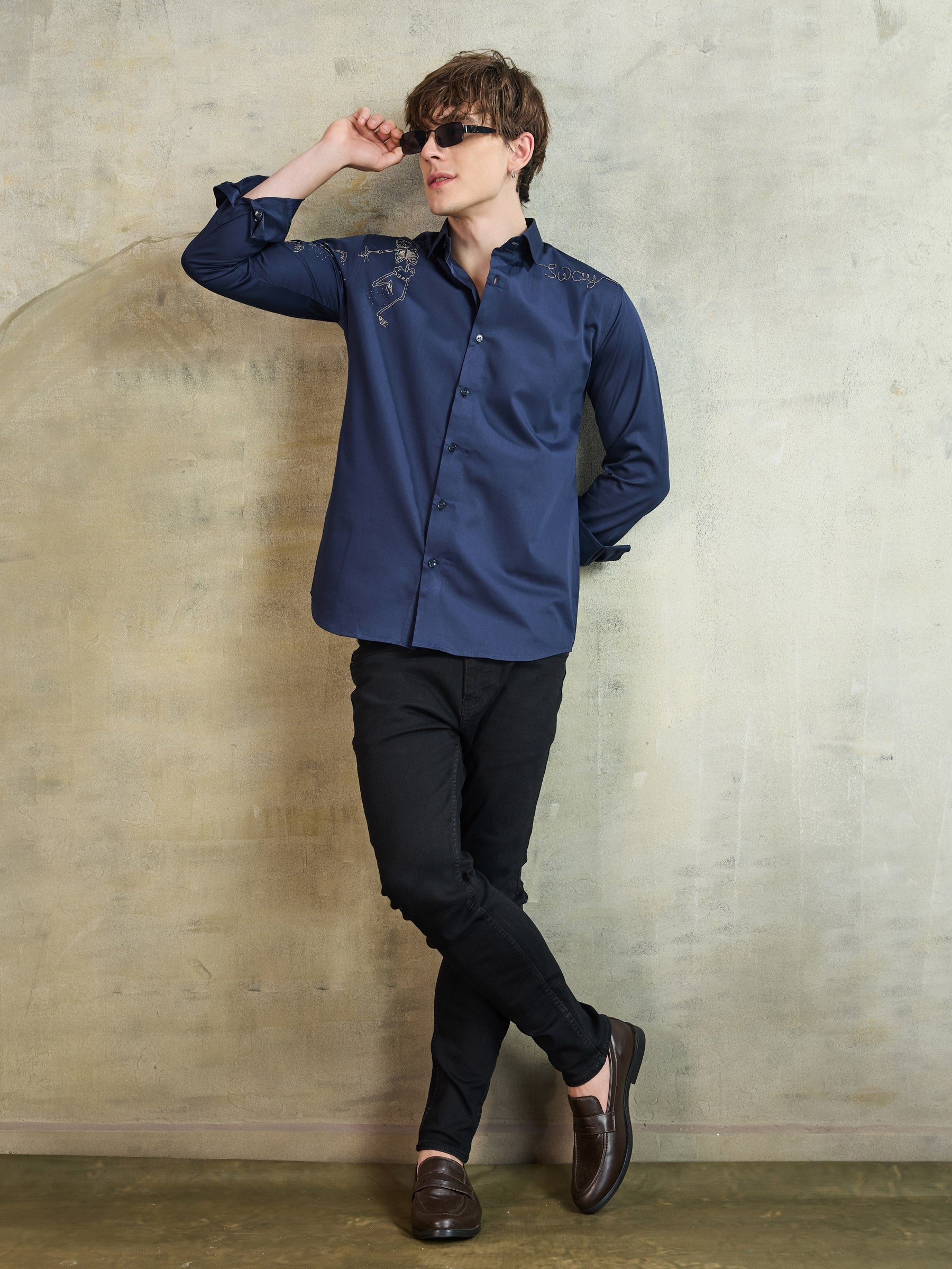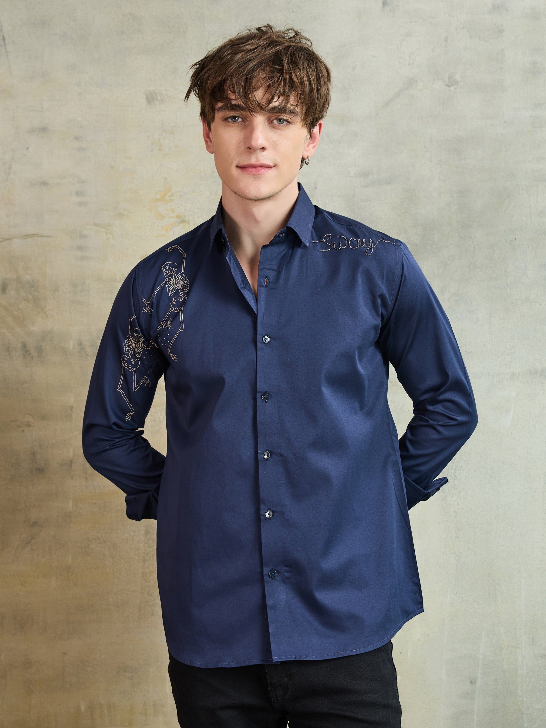 Tailored in pure cotton, this blue shirt stands out with its playful skeleton graphic. A contemporary piece for the bold and style-forward dresser.
