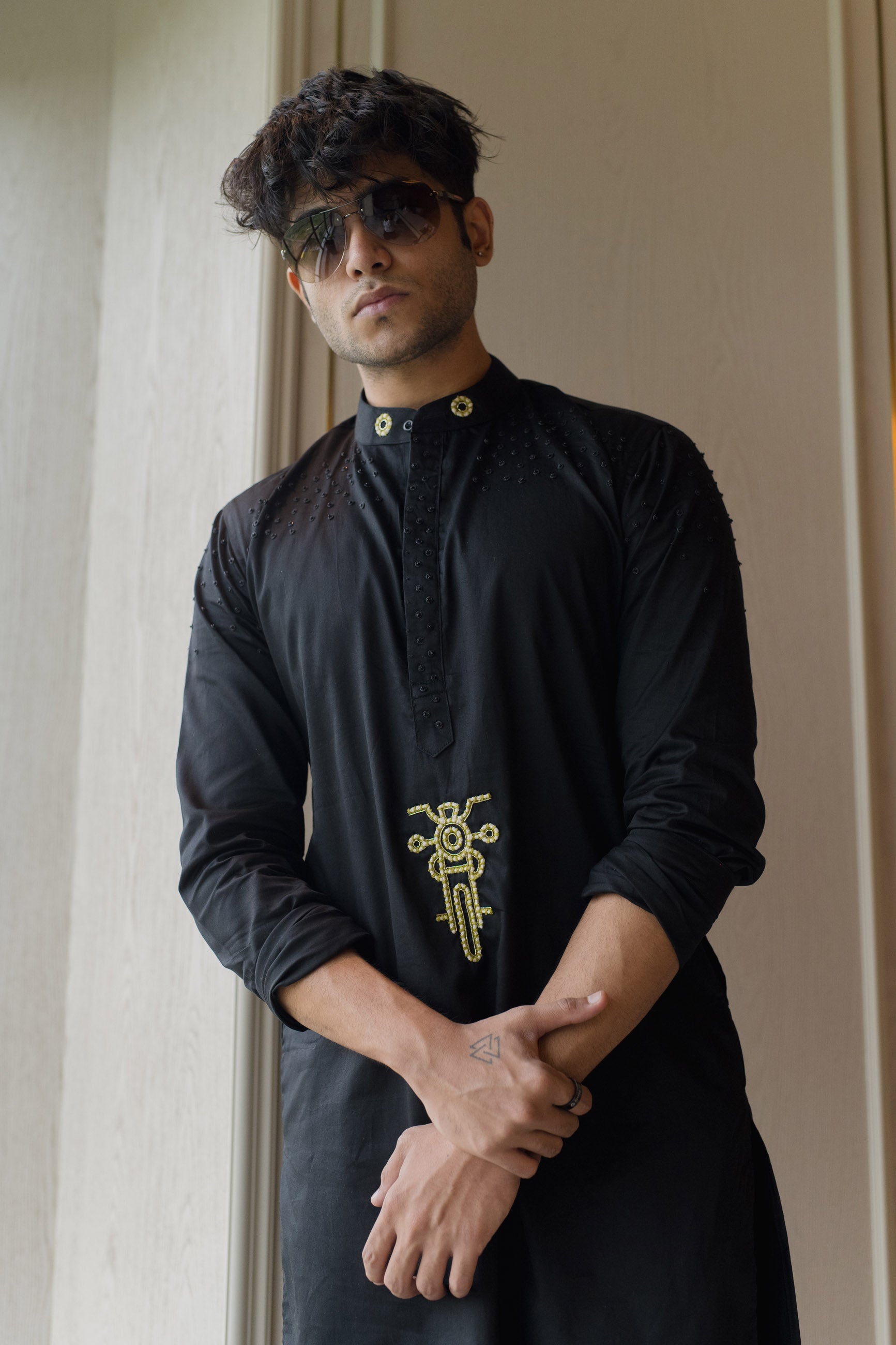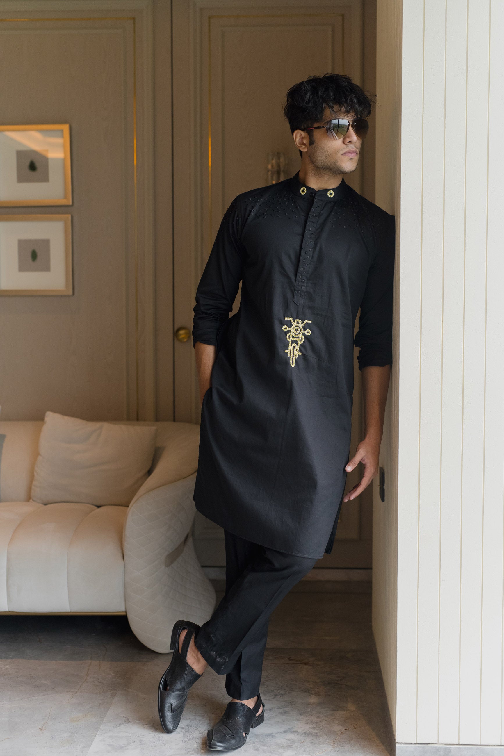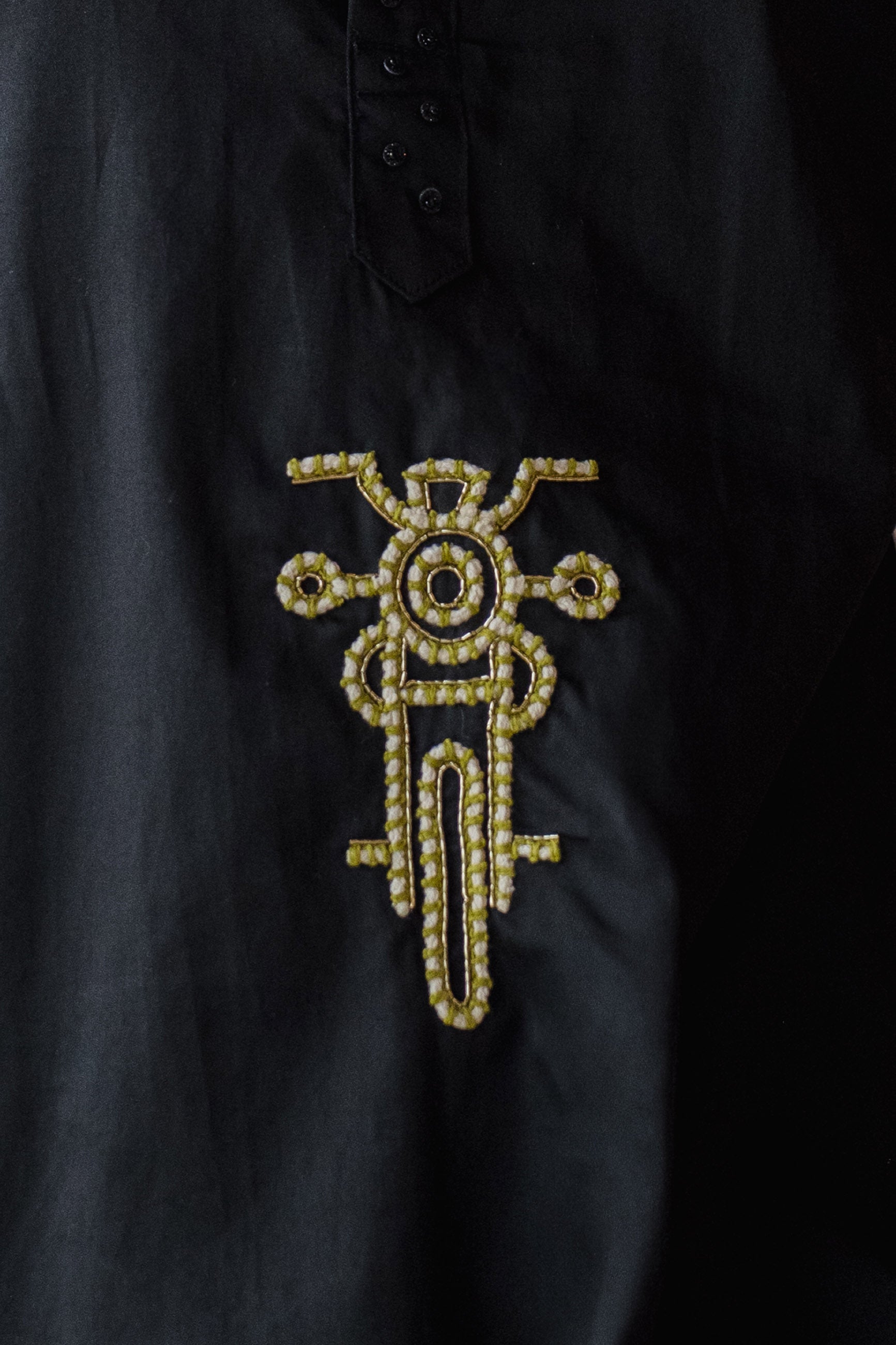 Rebel meets tradition in this black giza cotton kurta, featuring a bold motorcycle motif for the modern maverick.
