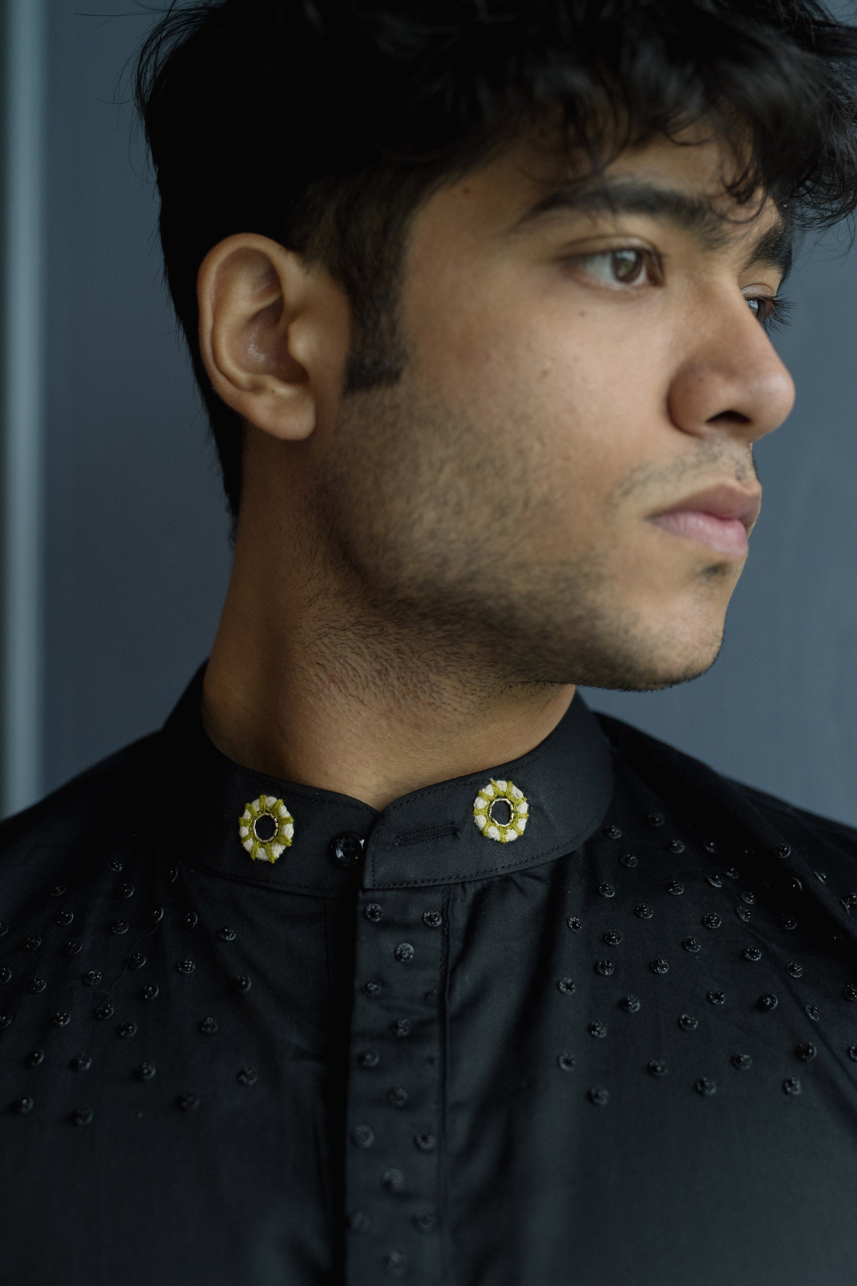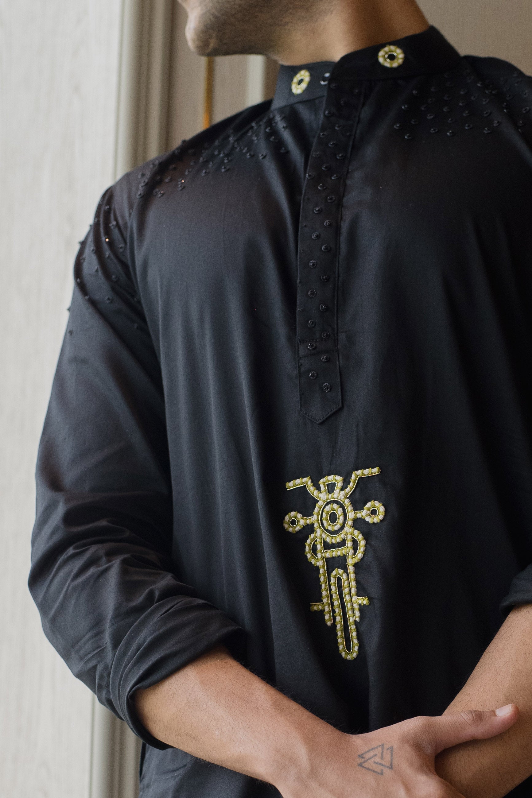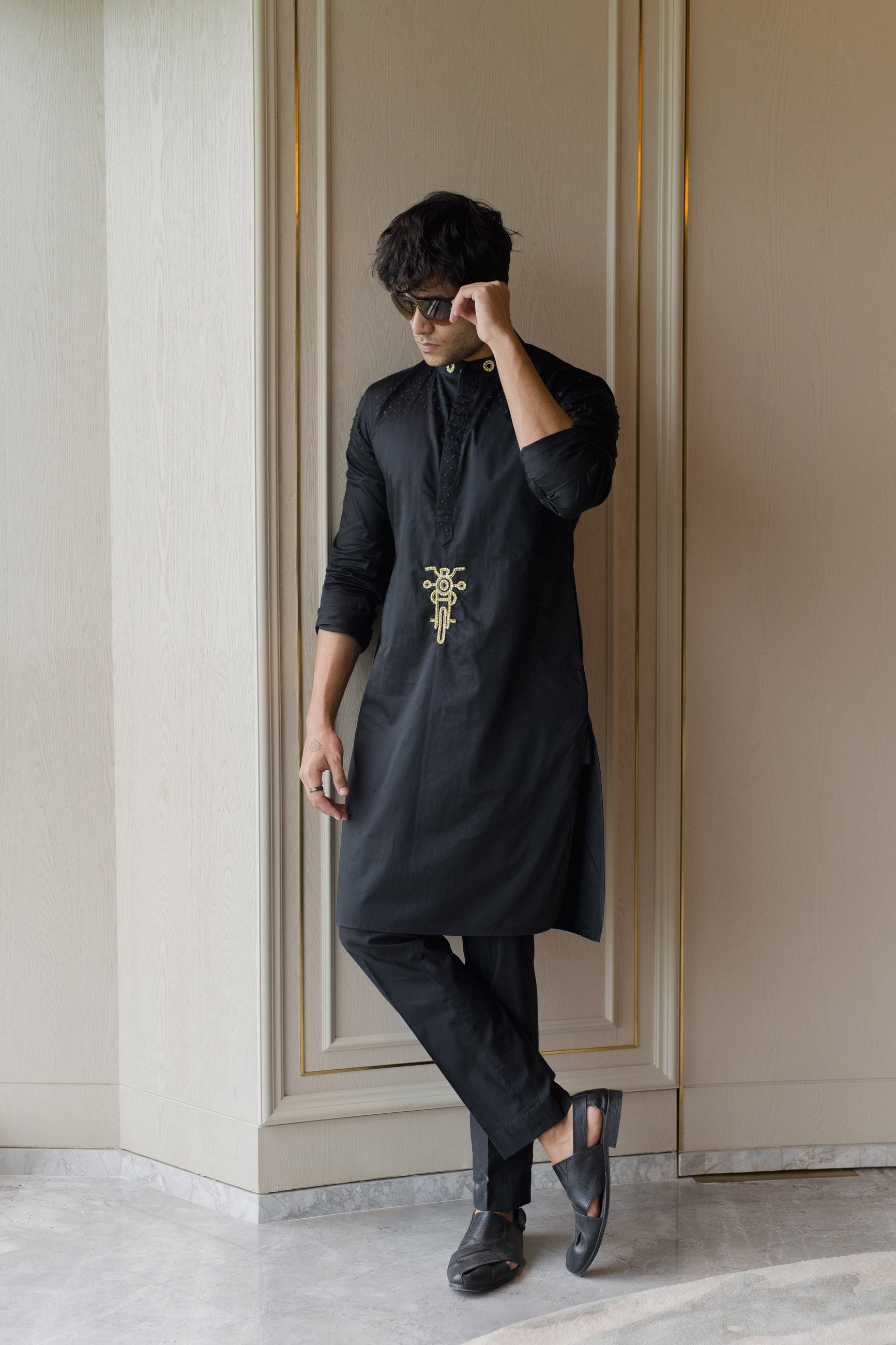 Rebel meets tradition in this black giza cotton kurta, featuring a bold motorcycle motif for the modern maverick.