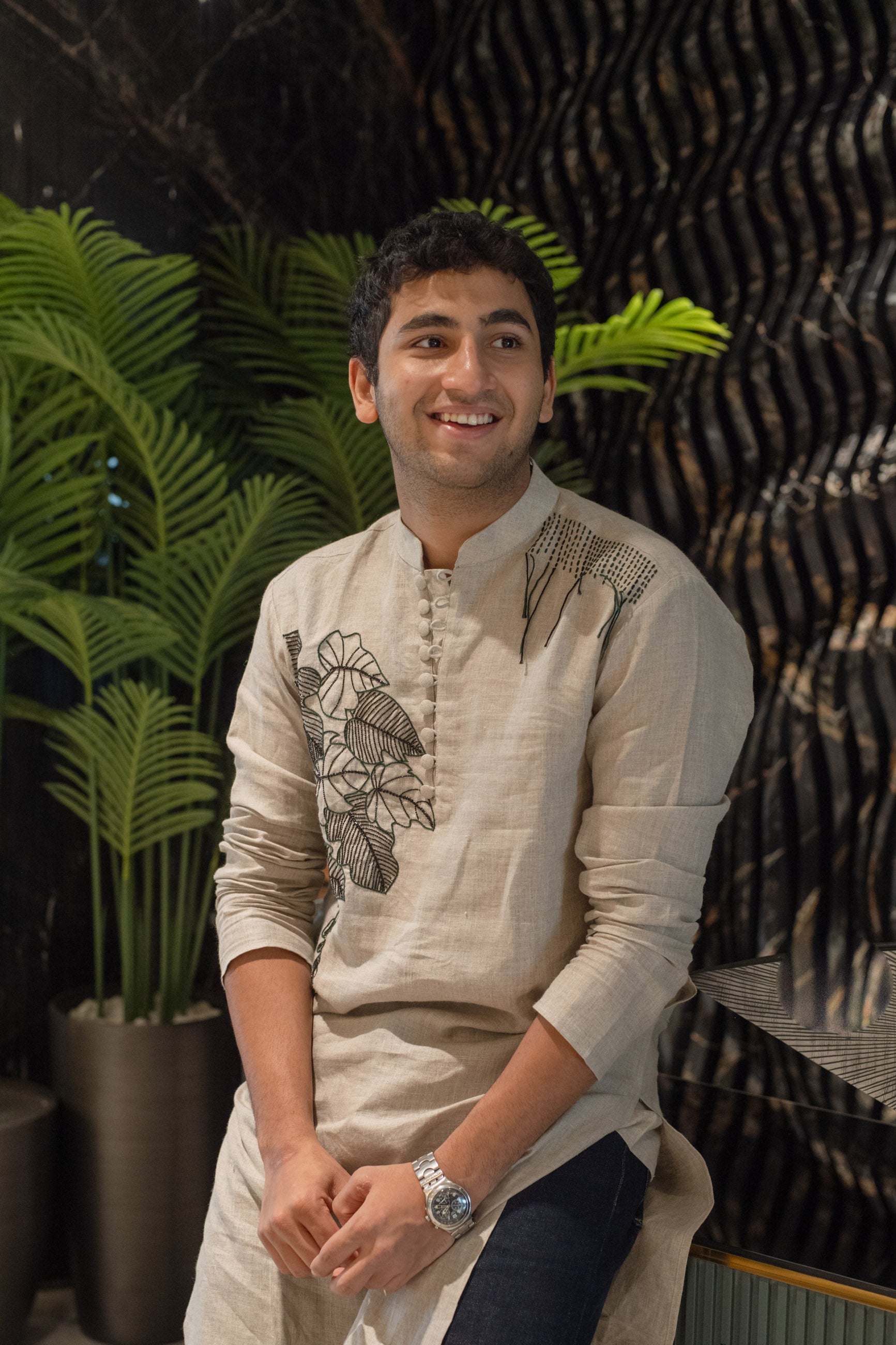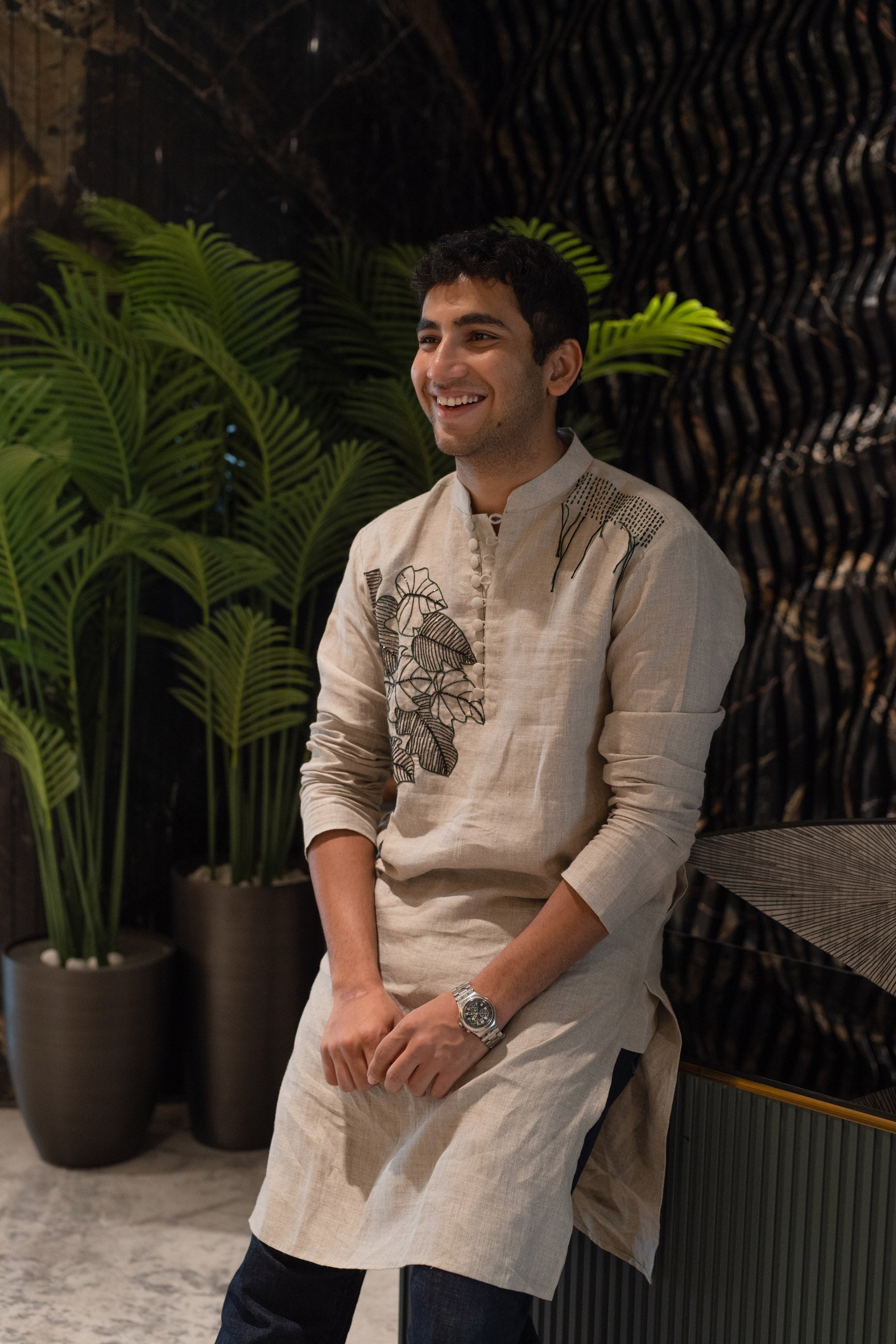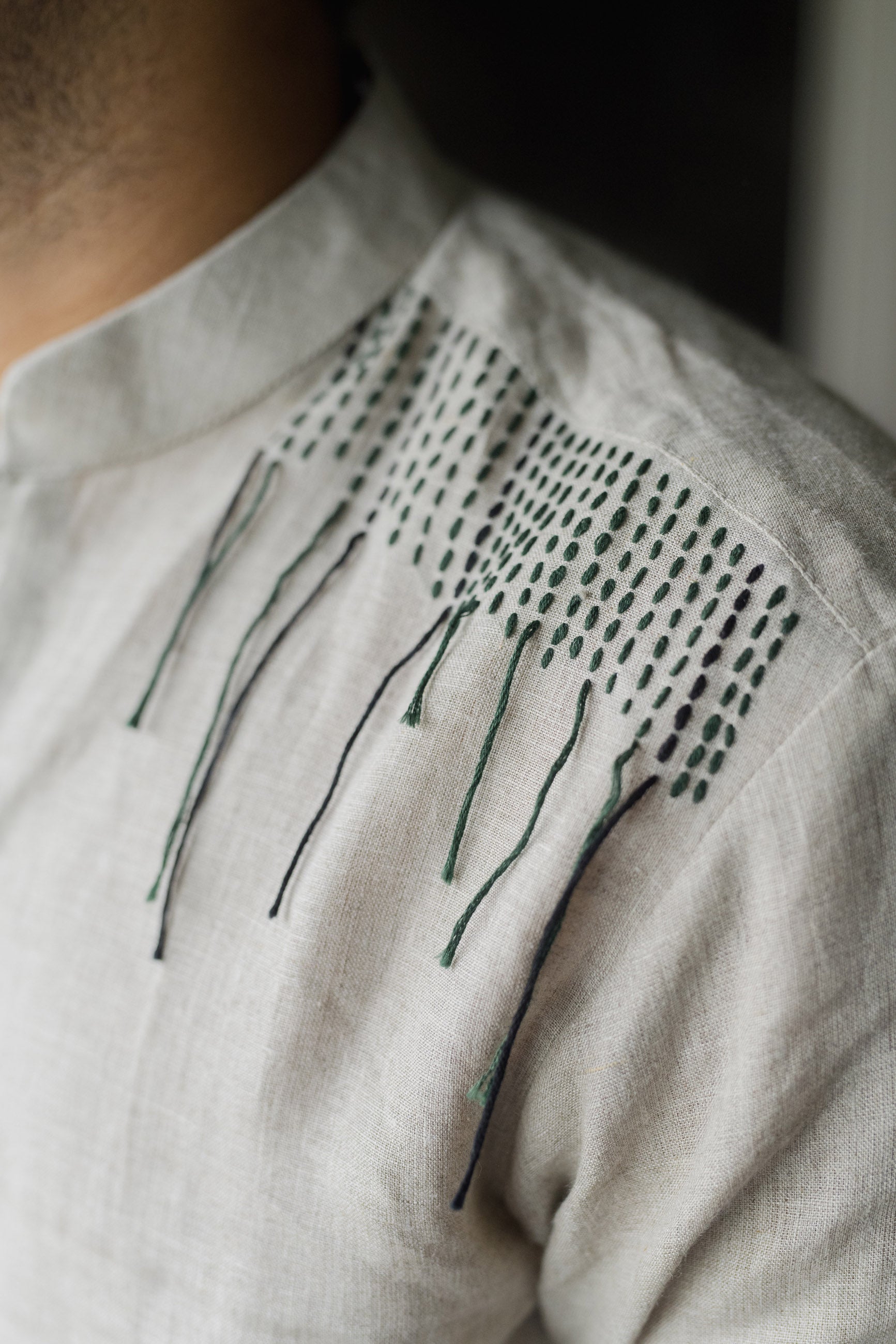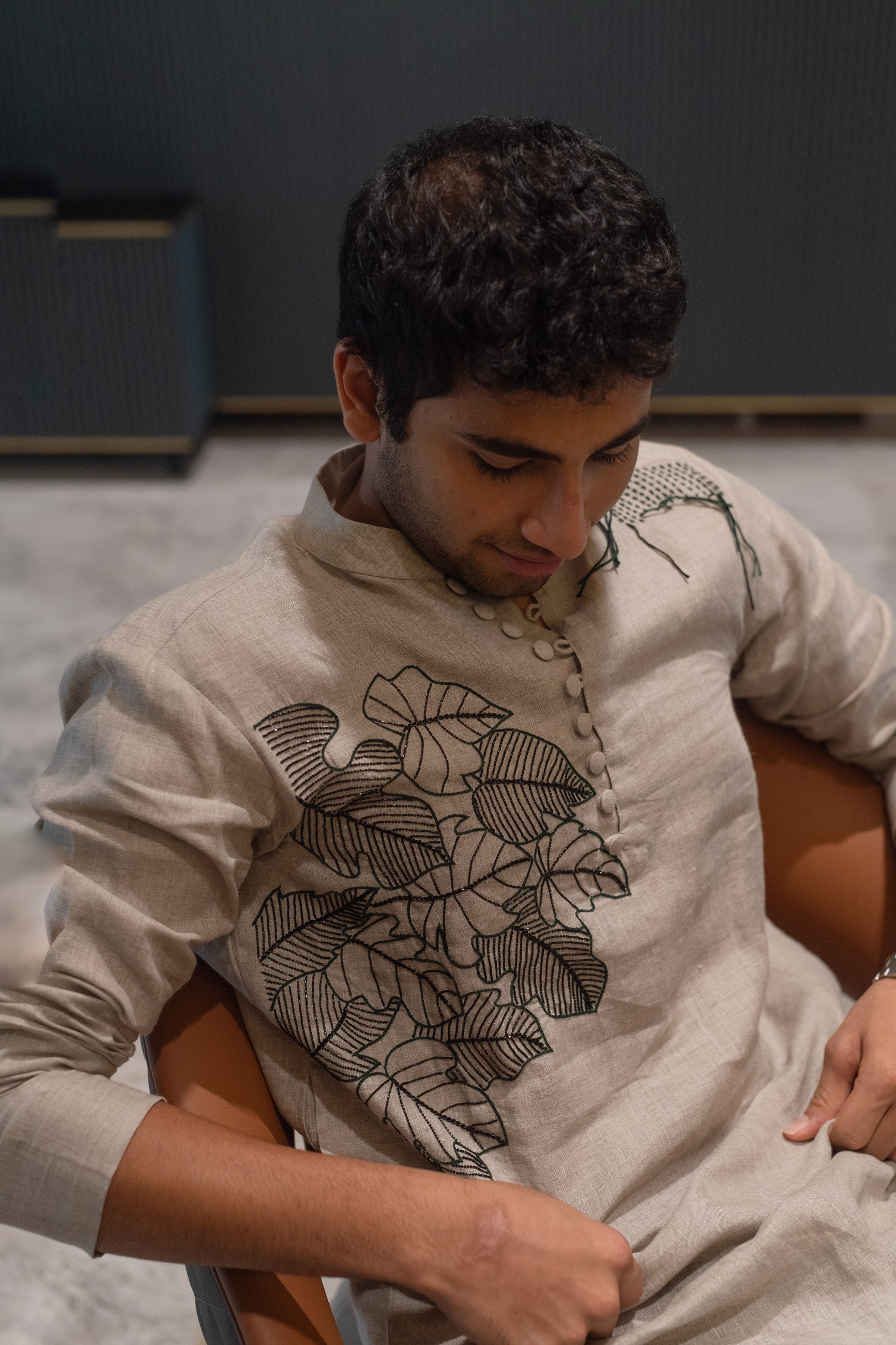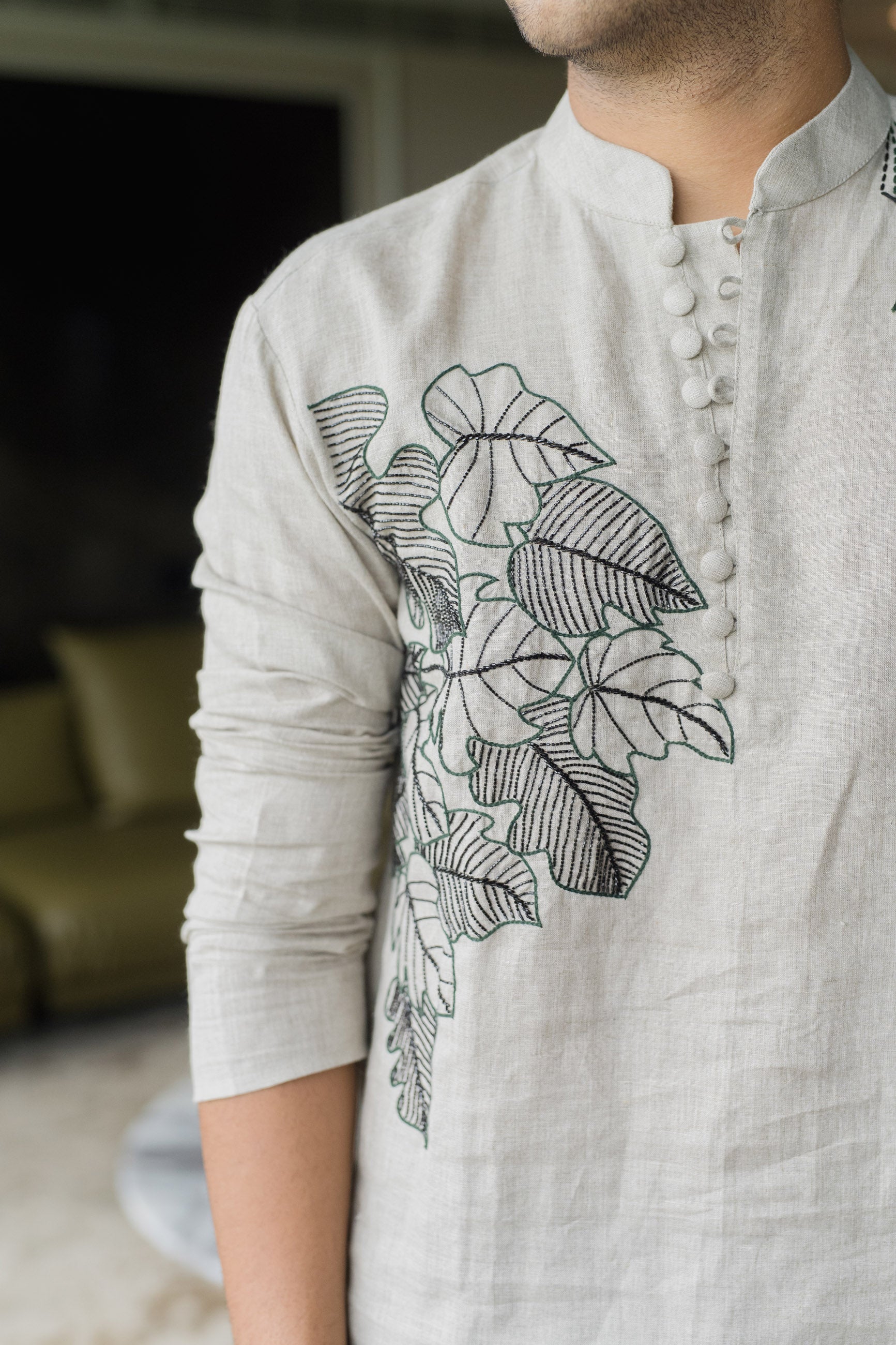 Timeless in tone, this grey linen kurta is elevated by intricate black threadwork—crafted for understated elegance.