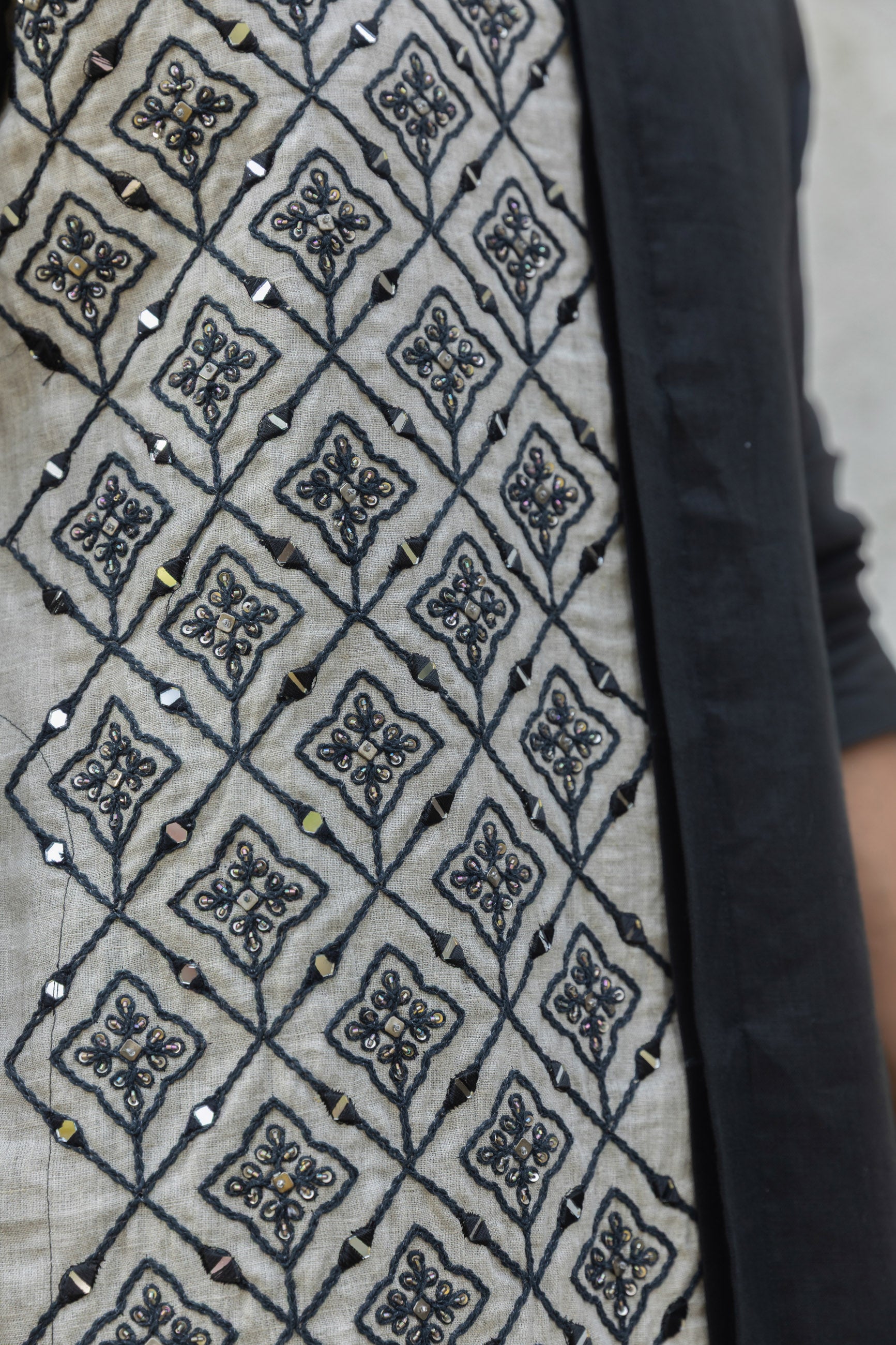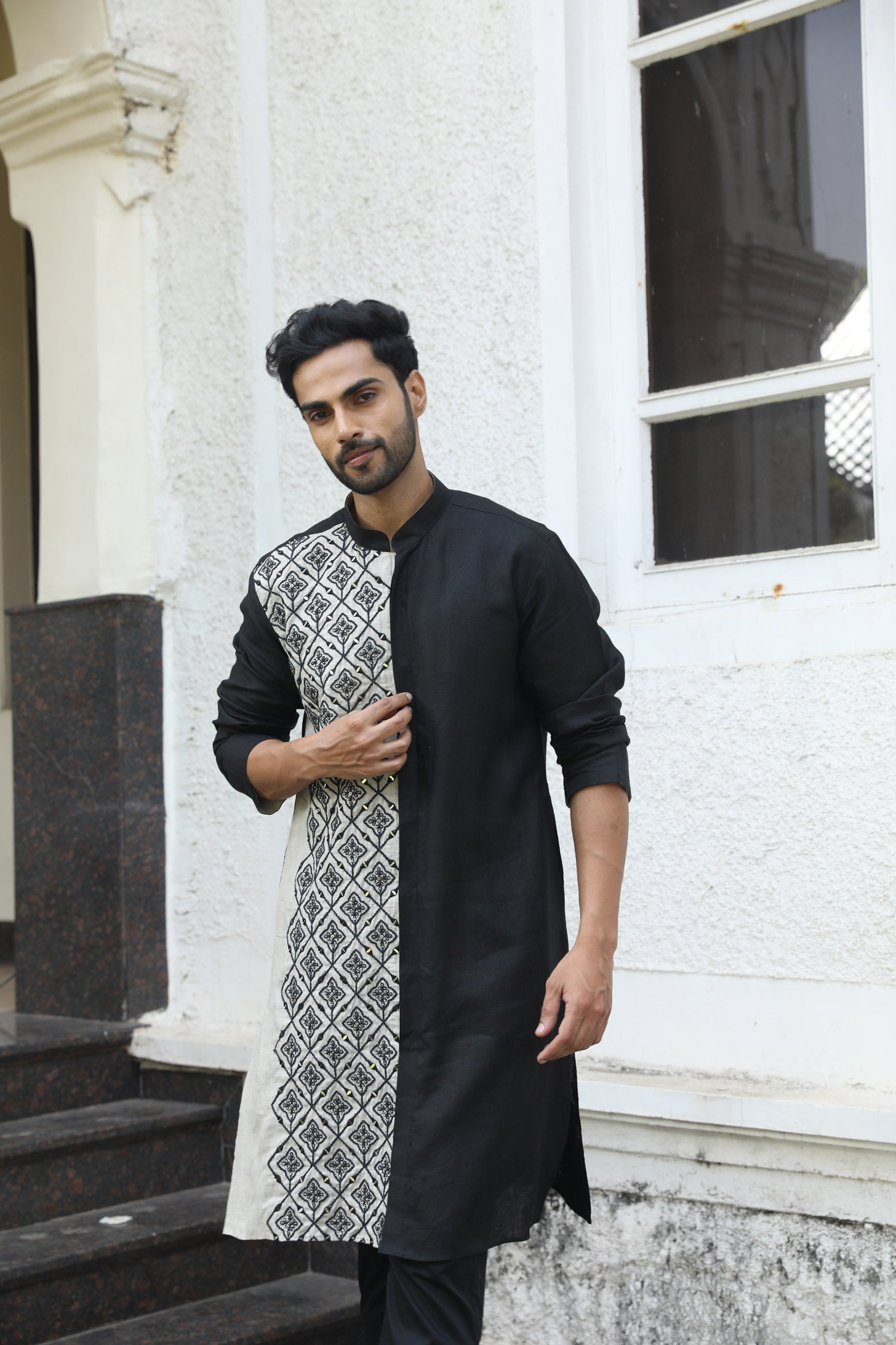 A chic black and white linen kurta that blends timeless elegance with contemporary design. Perfect for a versatile, stylish look at any occasion.