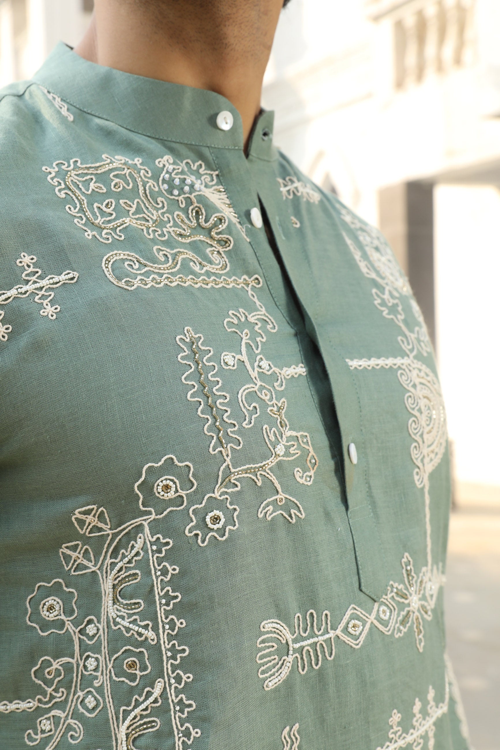 A refreshing sea green kurta in soft linen, offering a relaxed fit and breezy comfort. Perfect for effortless style on warm days.